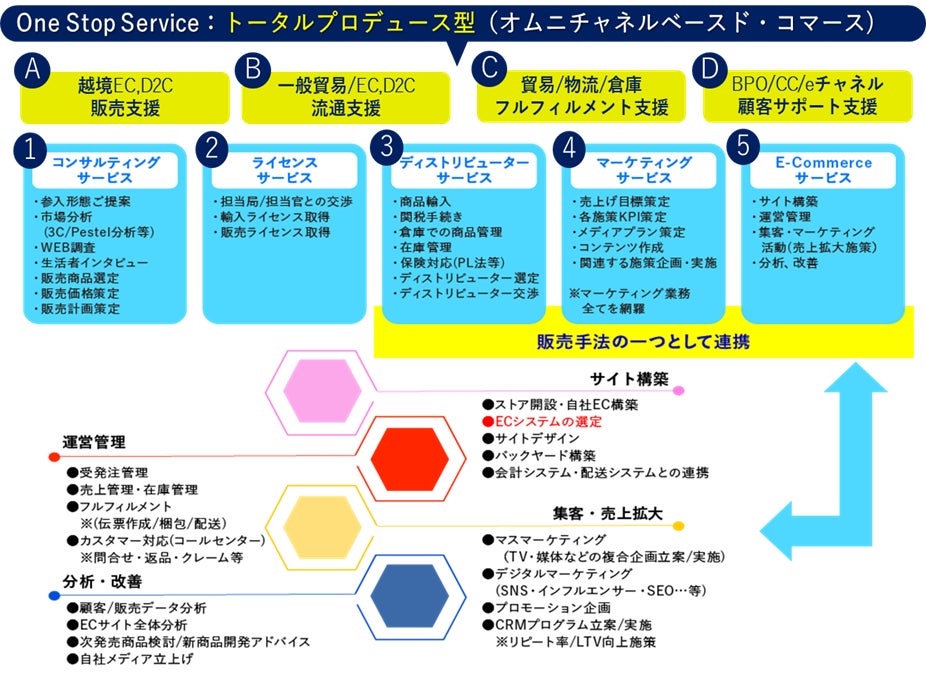 現在は、オフライン領域に加え、オンライン領域における「国内+海外プロデュース力」のEC/D2C(越境/一般貿易)販売、貿易通関・国際物流・倉庫・現地配送等のフルフィルメント・オペレーション」迄のワンストップサービスの提供を強化し、海外進出支援および、海外現地でのEC/D2C販売の体制構築や現地サポートを含めた「総合プロデュース・ビジネス・サービス」を提供。