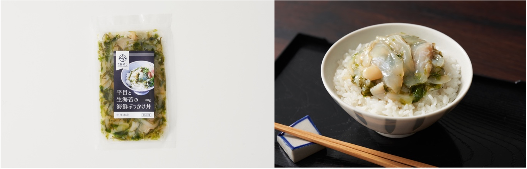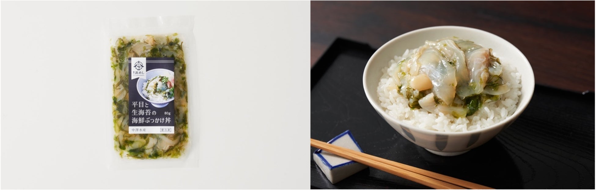 常磐沖で水揚げされる平目と相馬松川浦産の生海苔を使用しております。平目の旨味とやわらかな食感、生海苔の香りをお楽しみいただけます。味付けはやや甘味のある白醤油と新鮮な魚介類をふんだんに使用した秘伝ダレです。ご飯にかけるだけなので、共働きの方や子育てしている方でも気軽に頂けます。