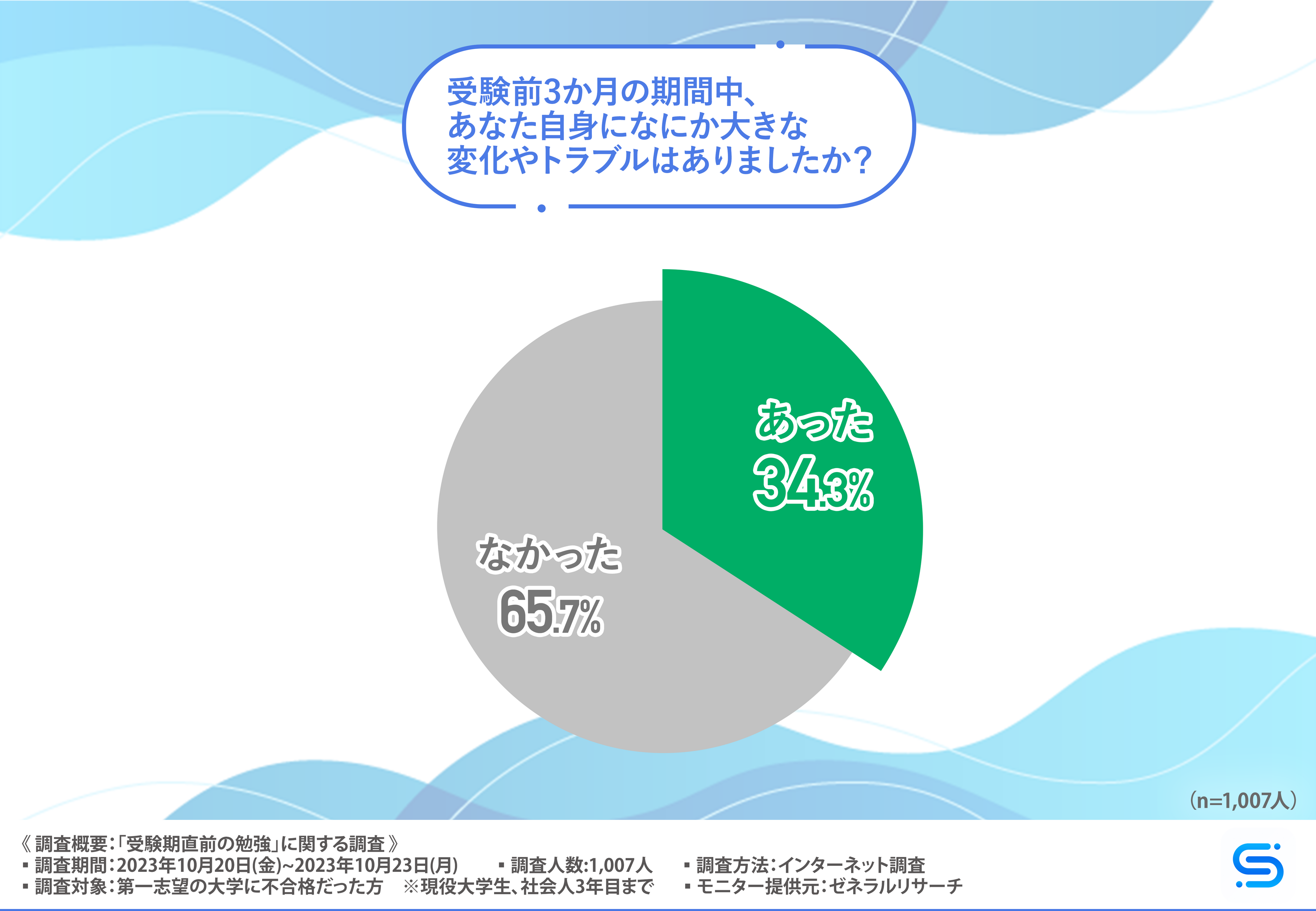 「受験前3か月の期間中、あなた自身になにか大きな変化やトラブルはありましたか?」と質問したところ、約3割の方が『あった(34.3%)』と回答しました。