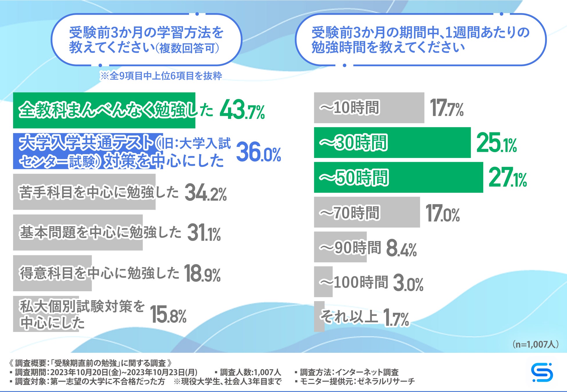 ここまでの調査で、第一志望の大学に不合格だった方の受験直前における勉強内容と勉強時間が明らかになりました。