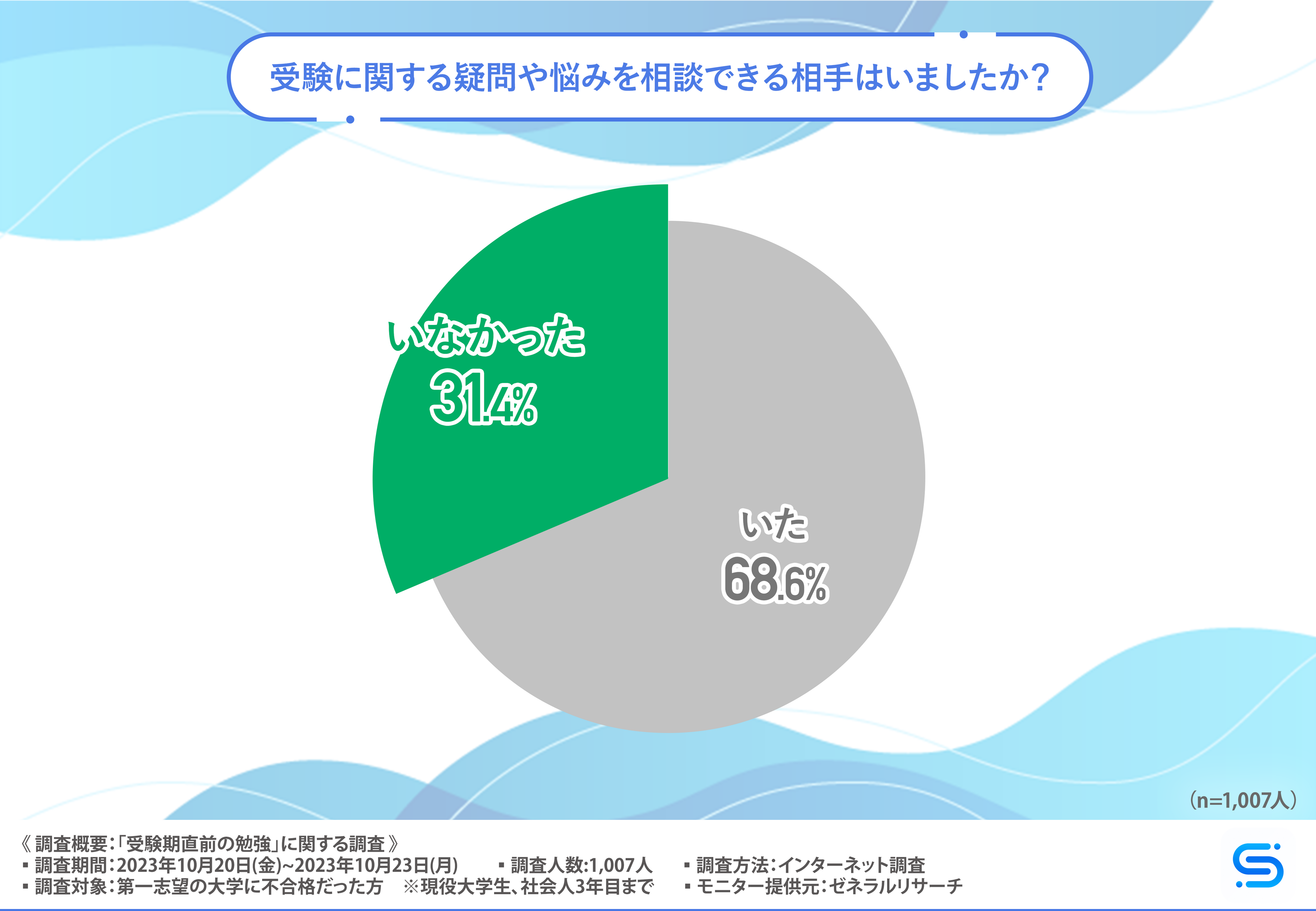 そこで、「受験に関する疑問や悩みを相談できる相手はいましたか?」と質問したところ、約3割の方が『いなかった(31.4%)』と回答しました。