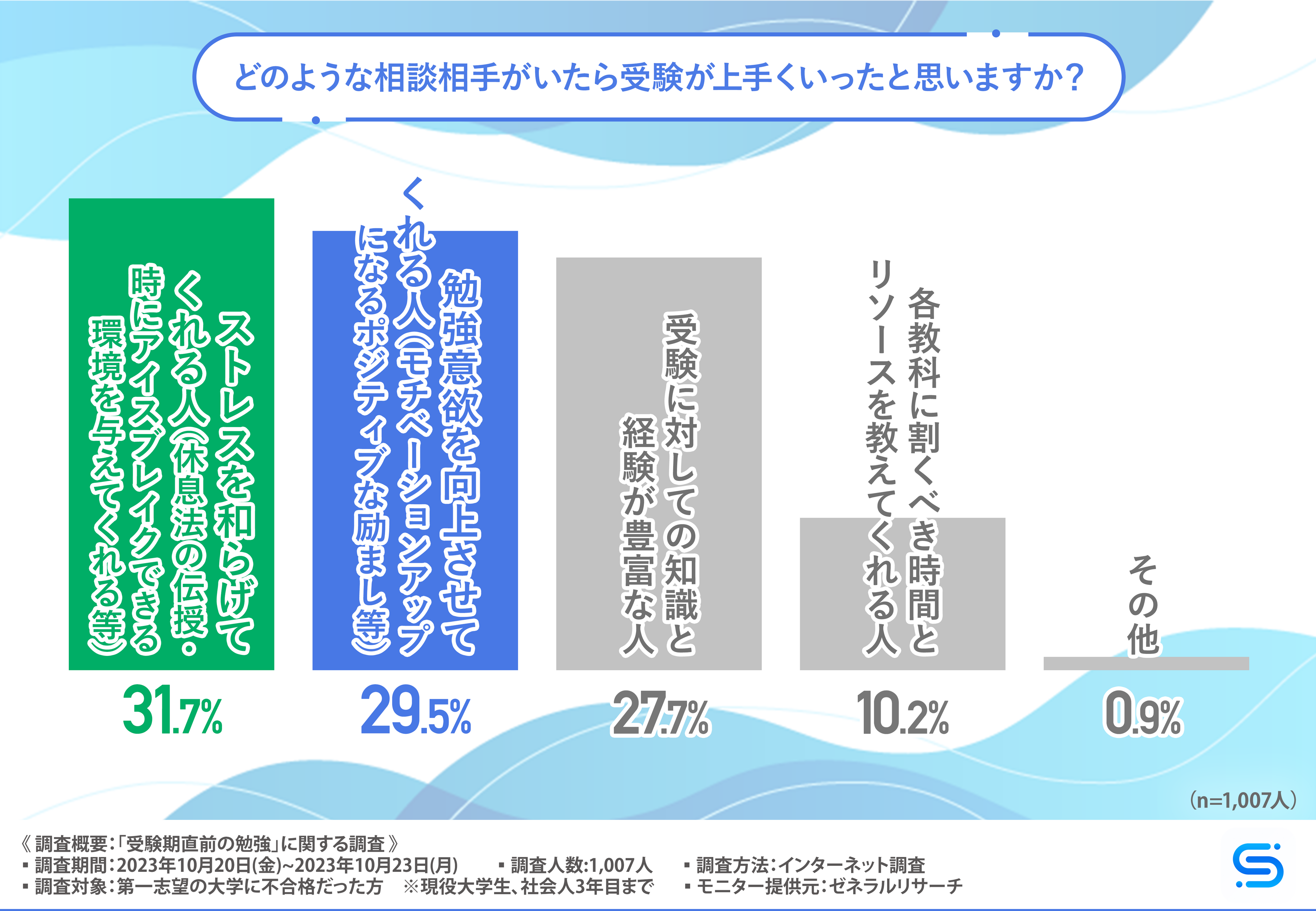 また、「どのような相談相手がいたら受験が上手くいったと思いますか?」と質問したところ、『ストレスを和らげてくれる人(休息法の伝授・時にアイスブレイクできる環境を与えてくれる等)(31.7%)』と回答した方が最も多く、次いで『勉強意欲を向上させてくれる人(モチベーションアップになるポジティブな励まし等)(29.5%)』『受験に対しての知識と経験が豊富な人(27.7%)』『各教科に割くべき時間とリソースを教えてくれる人(10.2%)』と続きました。