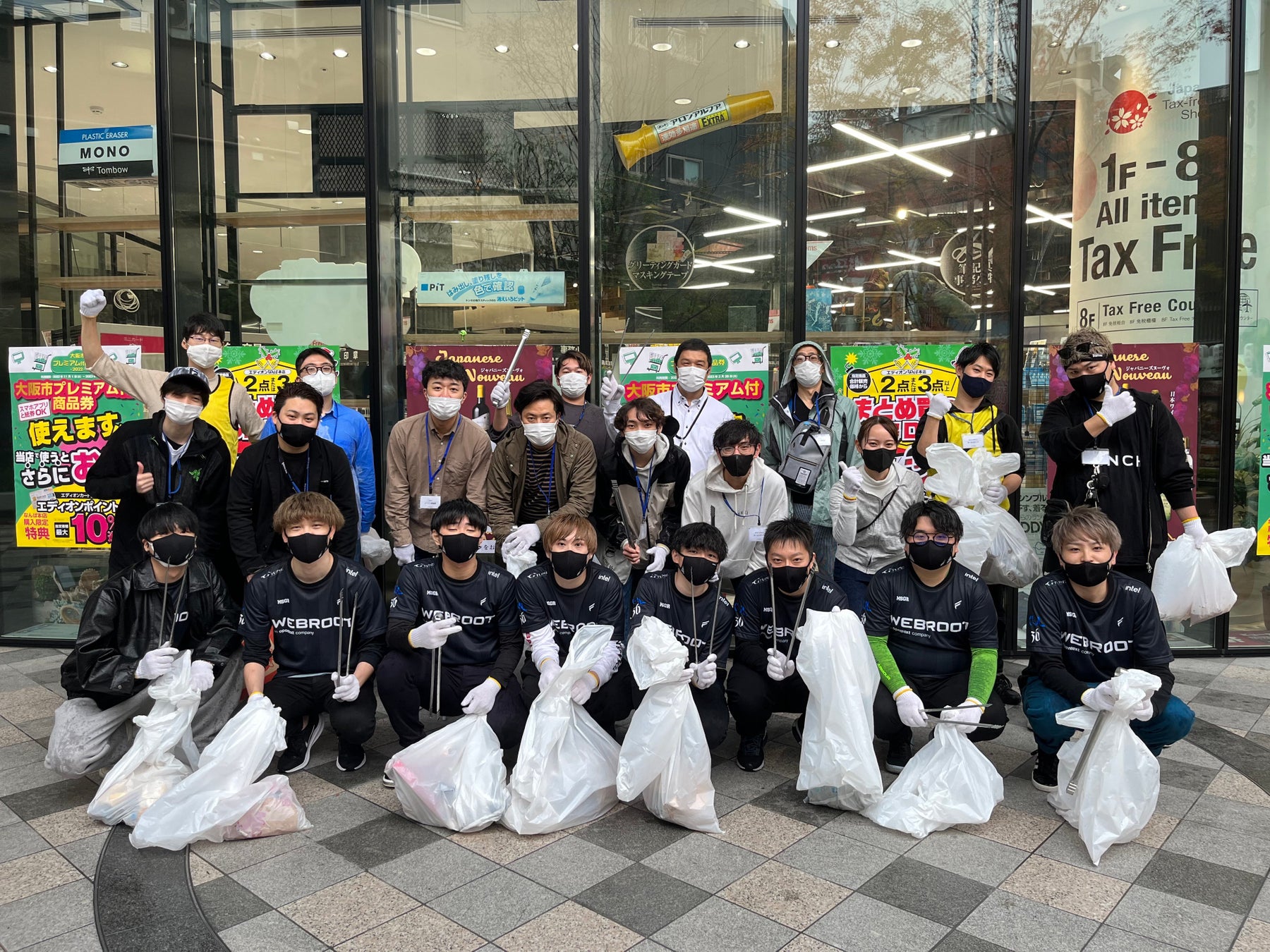地元を支えるまちづくり団体の活動に協力したいとの想いから、大阪なんばの清掃活動に取り組んでいます。約1時間にわたって、大阪市中央区の御堂筋周辺や千日前通りなどを巡回し、まちの美化に貢献しました。こうした取組みを今後も継続し、社会に貢献するプロeスポーツチームを目指していきます。
