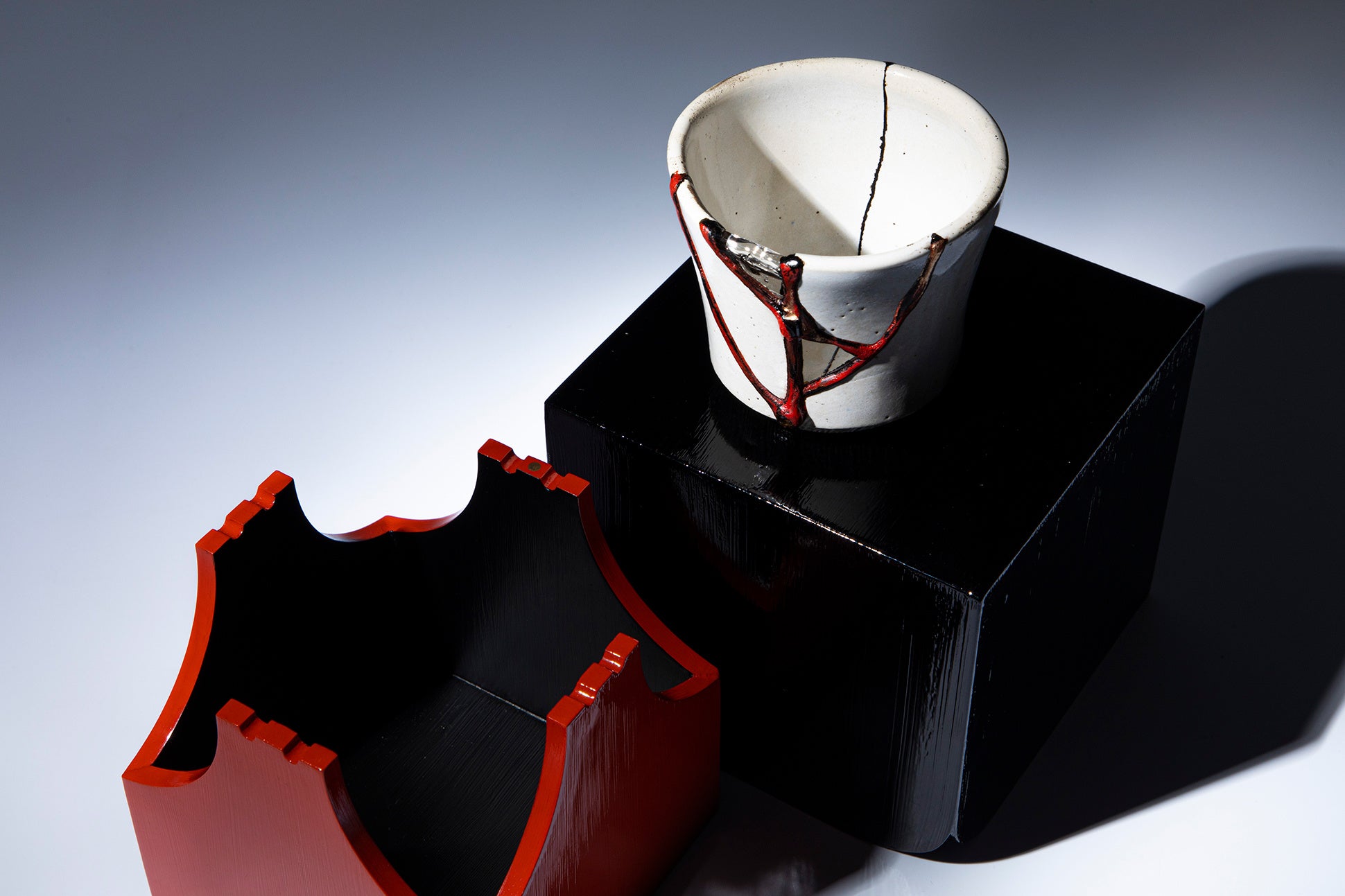 ひらのまりの出自の地、和歌山の根来に伝わる「根来塗り」という朱と黒の漆を掛け合わせた伝統の技法を用い、破壊された器を漆で継ぐ「根來継ぎ」。器の継がれた箇所は「景色」と呼ばれ、世界に二つと無い、唯一無二の芸術表現となっています。「景色」にはガラスを用い、今までの伝承文化を叩き、独自の視点で伝統文化としての新たな表現を目指しています。