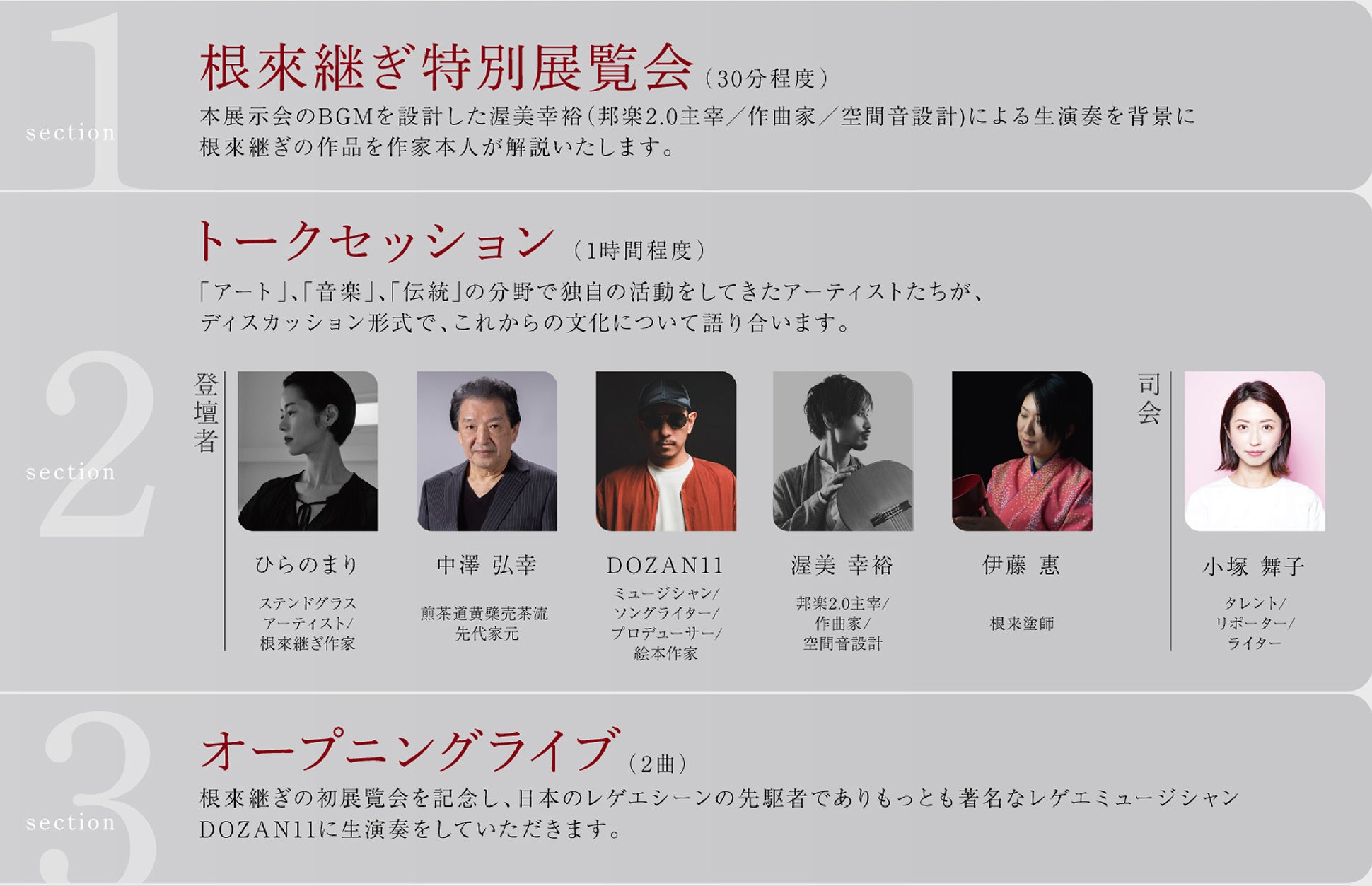 根來継ぎの初展覧会を記念し、日本のレゲエシーンの先駆者でありもっとも著名なレゲエミュージシャンDOZAN11に生演奏をしていただきます。