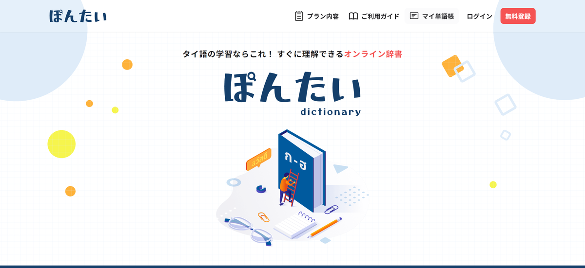 「ぽんたい辞書(β版)」は、約1.5万語の語句を収録するタイ語のオンライン辞書サービスです。タイ語と日本語の日常的な言葉について辞典として機能し、双方の言語の意味、表現を検索できます。さらに、学習したい単語を保存できるマイ単語帳機能やLINEでネイティブにタイ語に関する質問を投げかけることも可能です。