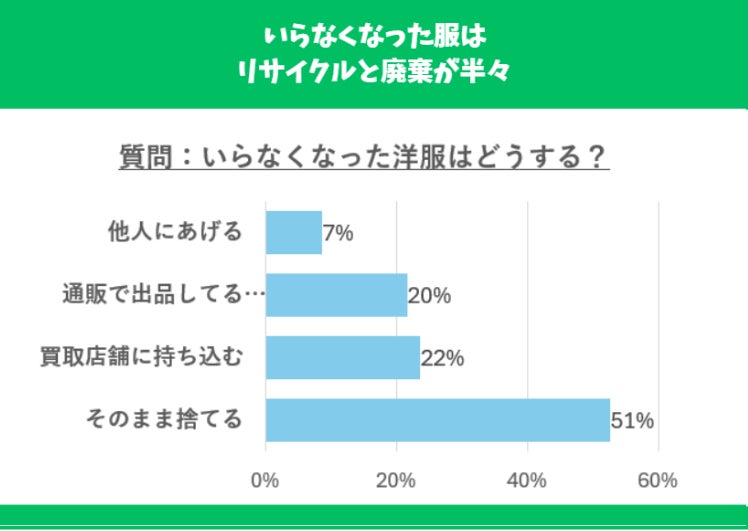 サイズが合わなくなったり、流行りの過ぎた洋服で、不要になったものは捨てる方とリサイクルして売る方とほぼ半分ずつという結果になりました。