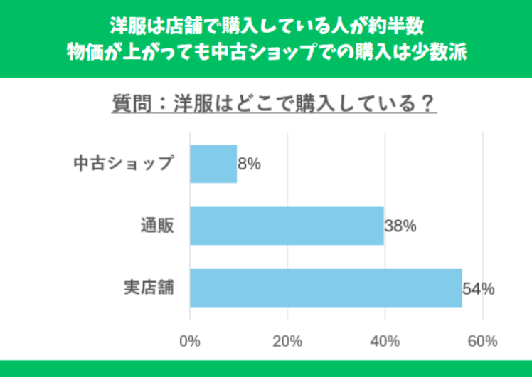 また、物価高の影響から中古ショップやリサイクルショップで購入する方が増えているのかと考えていましたが、「中古品は好まない」「汚れていそう」というコメントがあり、洋服に関しては新品を好む方が多数派のようです。