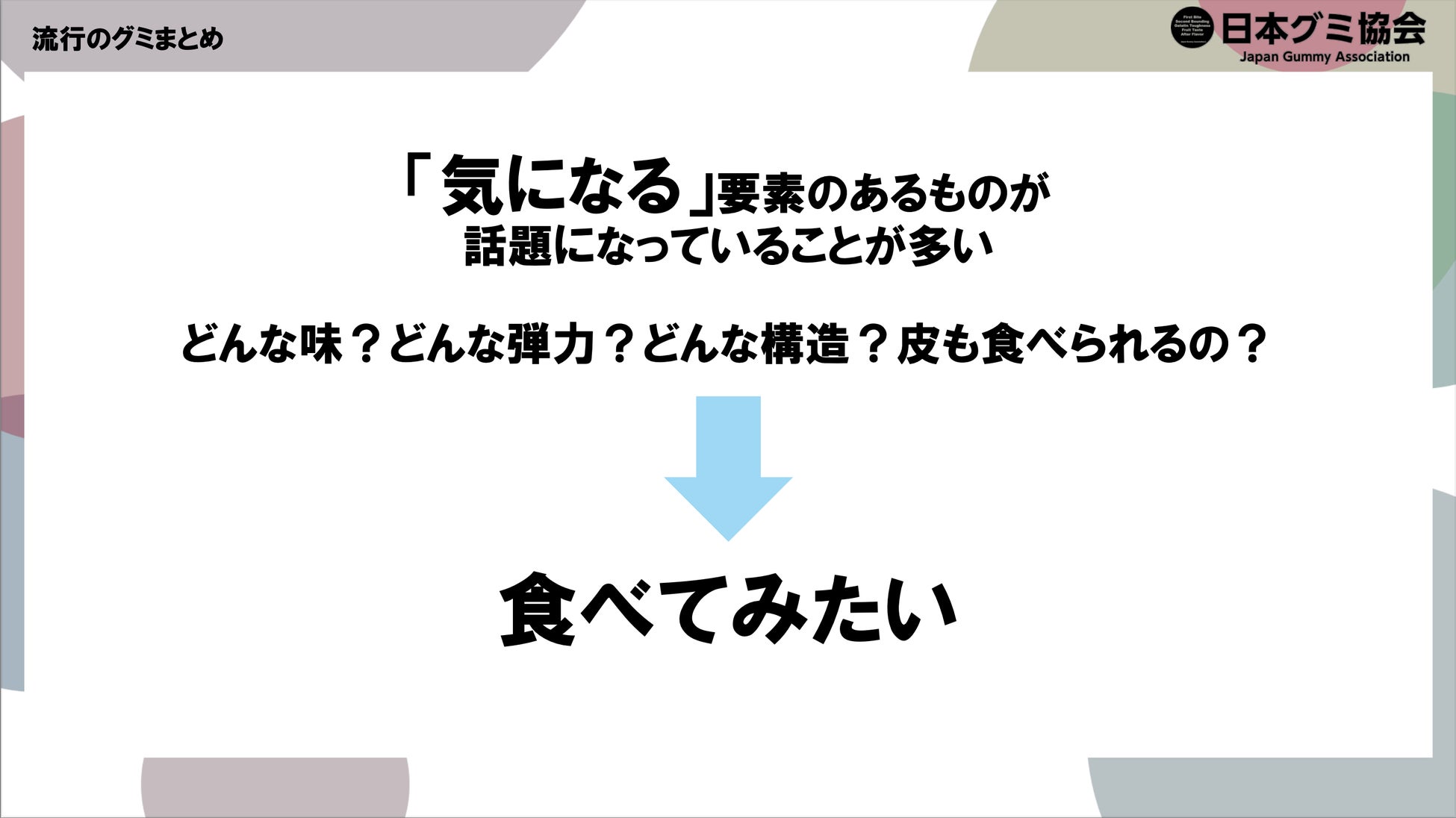 「最近の流行グミには、“雲” “水” “空気”などの食べ物以外や存在しない果物の味をモチーフにした・・・一体どんな味なんだろう?と気になるもの。実際の果物のように皮がむける・・・一体どんな構造なんだろう?と思うもの。など、消費者の「気になる」要素を持つものが多くあります。これらのグミは、ユニークで新しい体験を提供することで、消費者の関心を引き、話題となっています。」と個別の傾向についても深堀することができました。