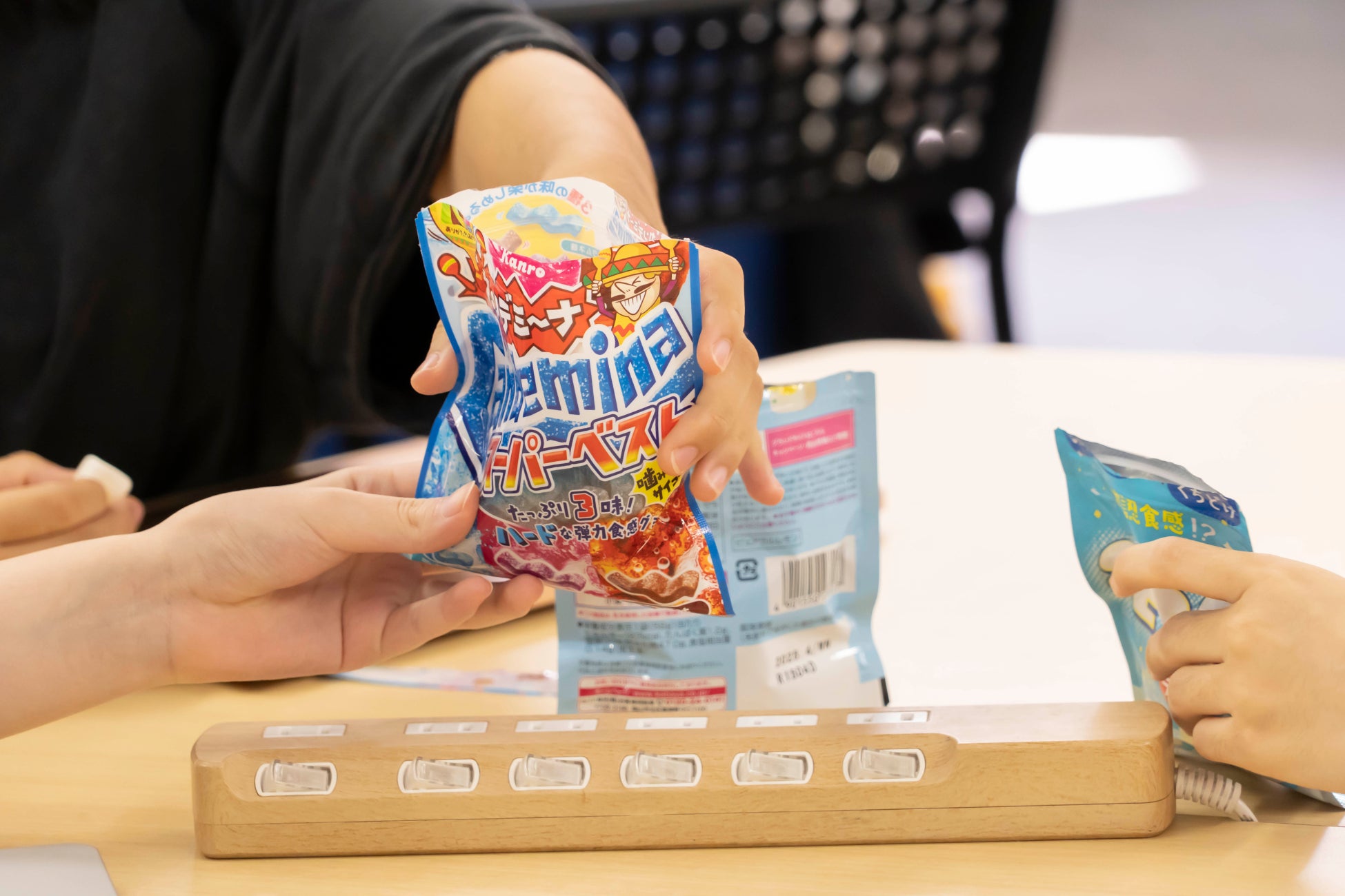 「グミの授業をしてください」と依頼された時に、「ついにグミが授業になる時代になったのか」と感心したと同時に、前例のないことだったので何を取り扱うべきか・どのくらいの情報量を詰め込むかについては一番時間を費やした部分でした。今回は授業の最初にグミを配布してから講義をする流れをとりました。生徒のみなさんも普段、授業中にお菓子を食べることはないため楽しそうな様子が伺えました。実際に近くの席の人とグミを交換してもらったことで、グミの多様性や自由度に触れ、その後の講義内容にも興味を持ってもらえたと感じています。講義後の質疑応答で「気になるという要素があればグミ以外のお菓子でも話題になるように思うが、グミとグミ以外のお菓子の差は何か」という、グミの本質について考えさせられる質問もありました。グミは自由なお菓子ゆえに他のお菓子に比べて種類も多く選択の幅が広いからではないかと考えます。グミは食べるだけではなく、今回のように思考を深めたり、コミュニケーションツールにもなることを授業を通して改めて感じられ、大変貴重な経験となりました。