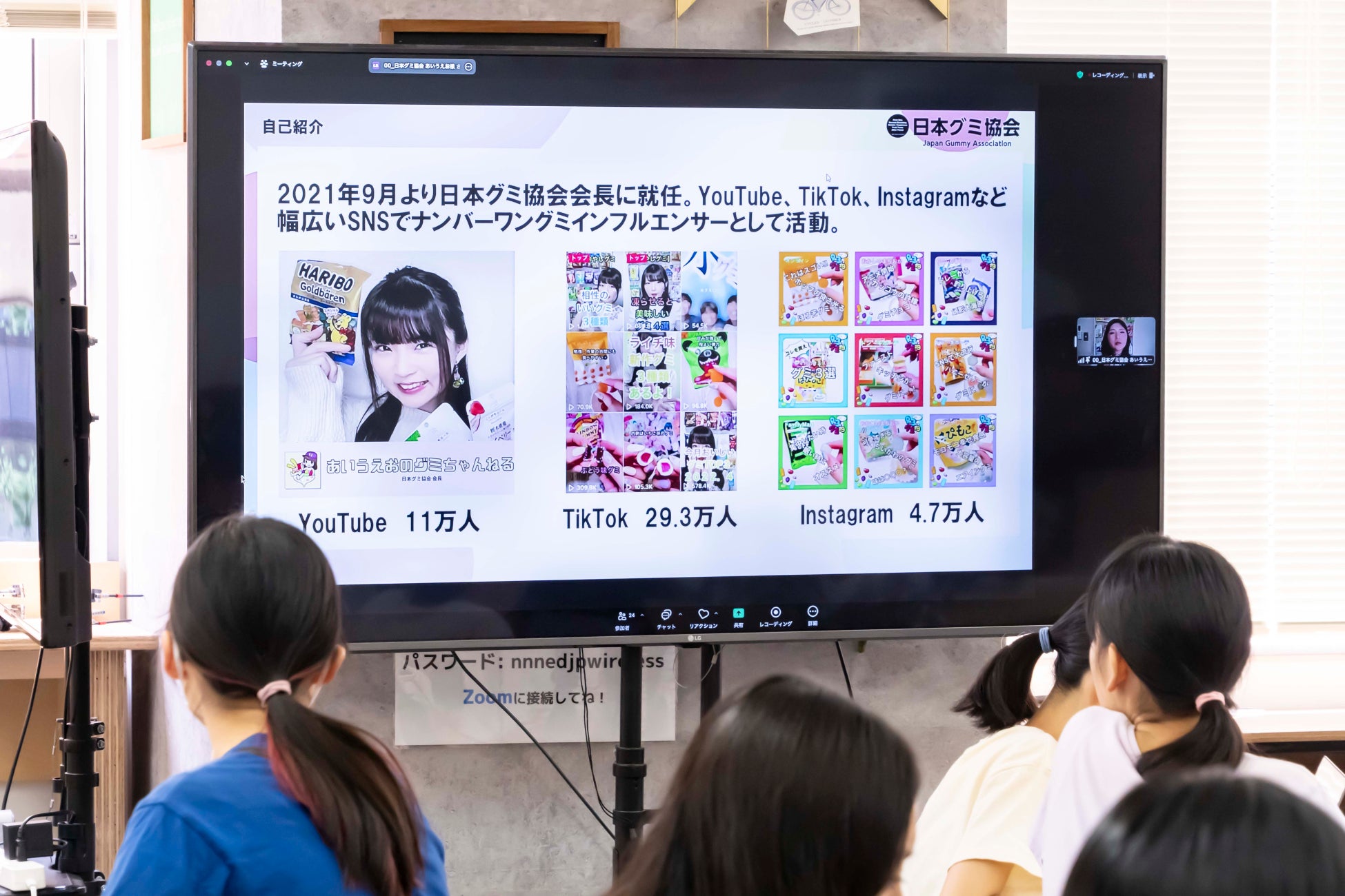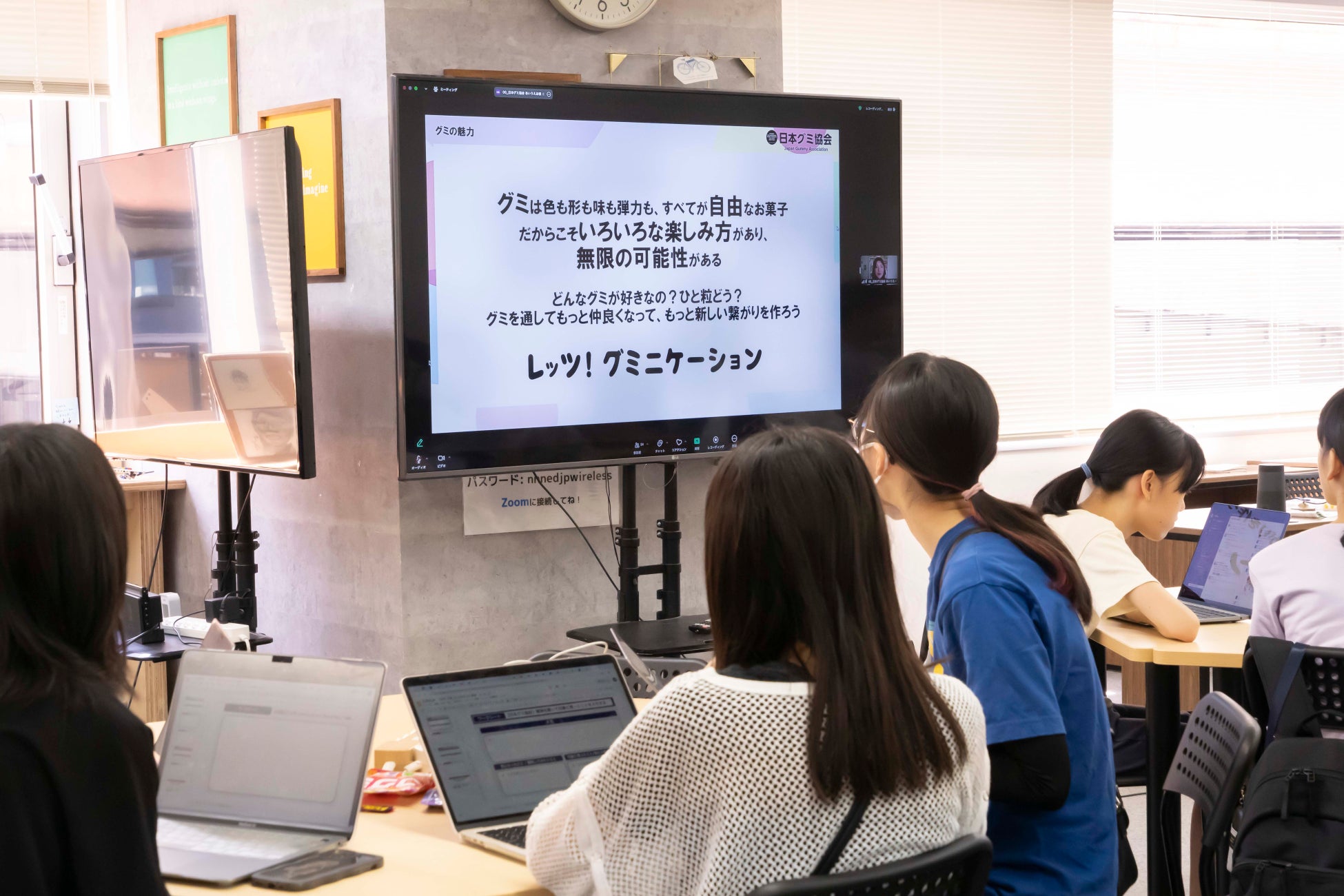 グミは味や色、形や弾力が自由で、持ち運びもできる多様性に溢れたお菓子です。それだけでなく、一人ひとりの推しグミがあったり、誰かとシェアして会話のきっかけになったりと、コミュニケーションが生まれるお菓子の役割もあります。そんなグミの魅力を伝えるべく、『学⽣グミニケーション活性化プロジェクト』の一環で、9月4日に角川ドワンゴ学園N中等部に、日本グミ協会の会長あいうえおが“グミの特別授業”を実施しました。本授業では、「グミの歴史」や「近年のグミブーム」「流行のグミの特徴」などを実例を用いて紐解きながらグミの魅力を伝えました。さらに、グミを通して仲良くなったり、繋がりを作る「グミニケーション」についてもお話ししました。