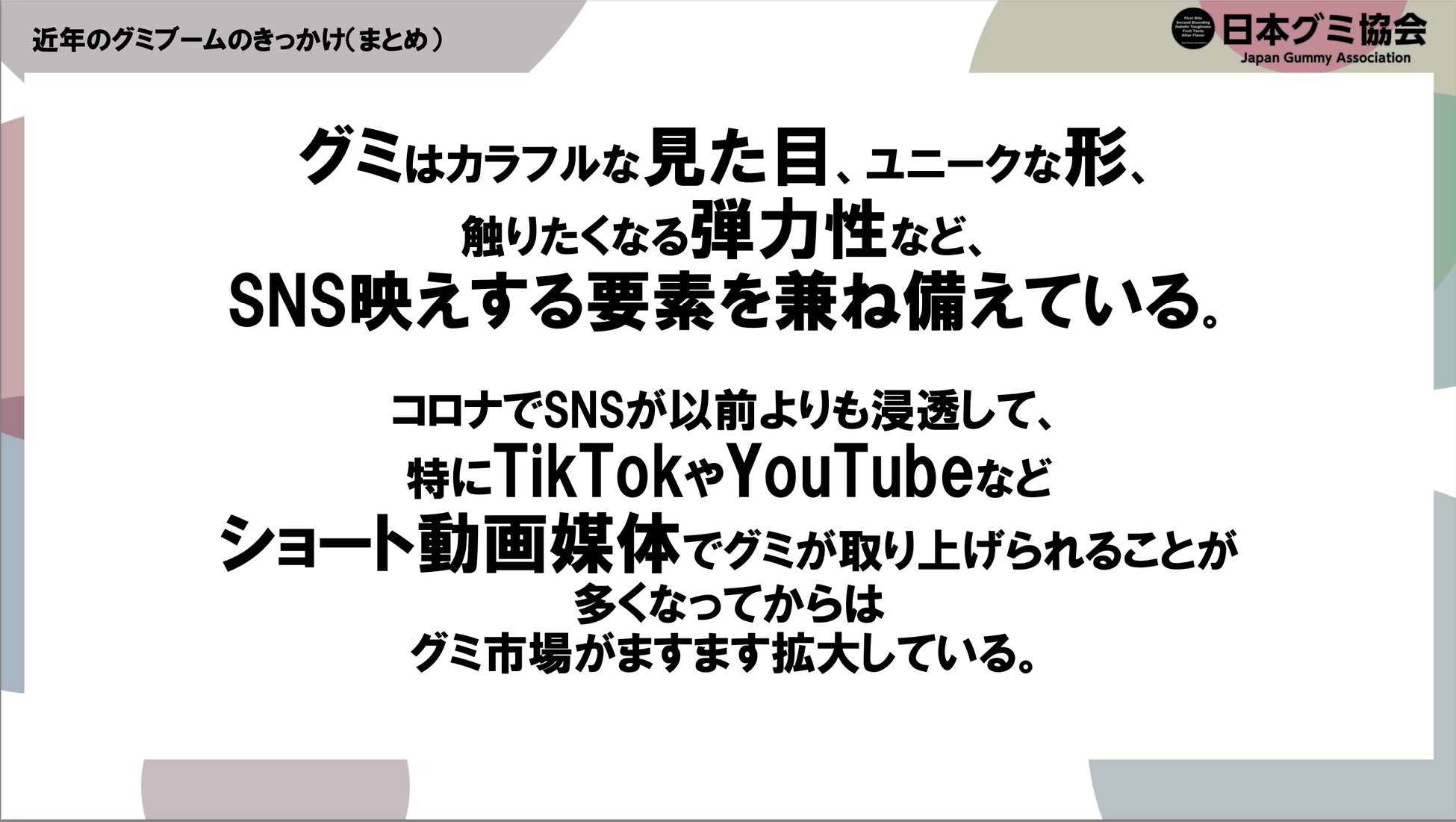 グミブームについても話す機会があり、「近年のグミブームは、主にSNSやASMR動画の影響によるものが大きく影響していると思います。グミはそのカラフルな見た目やユニークな形状、触りたくなる弾力性などが、視覚や聴覚を通じて楽しめる要素として注目され、特にTikTokやYouTubeなどのショート動画媒体を中心に各種SNSで取り上げられることが多くなりました。これにより、グミの人気はますます高まり、コンビニの売り場も2倍以上になったりと・・・売り上げも右肩上がりとなっています。」と得意のSNSでの体感を元に独自の見解を伝えることができました。