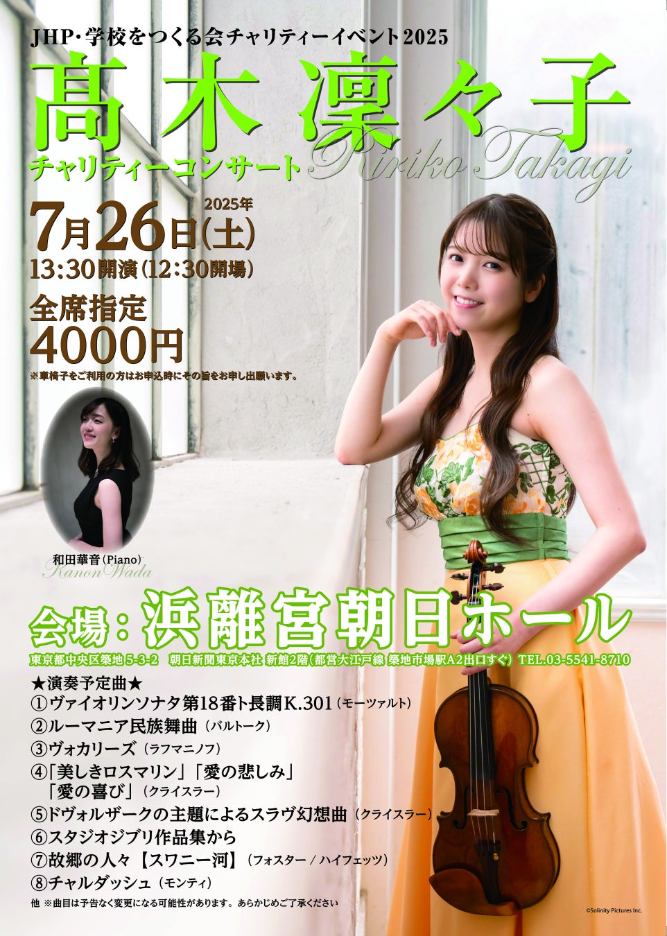 JHP・学校をつくる会(正式名称:特定非営利活動法人JHP・学校をつくる会)は、チャリティーイベントとして、7月26日(土)浜離宮朝日ホールにて、「髙木凜々子チャリティコンサート」を開催いたします。