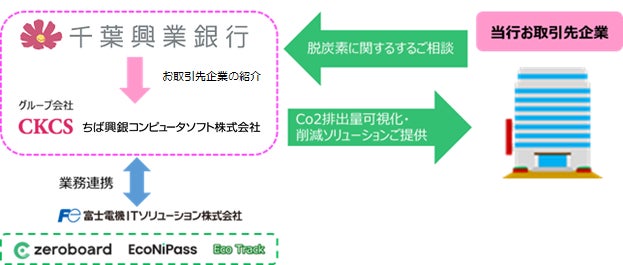株式会社千葉興業銀行(頭取 梅田 仁司)および当行グループ会社であるちば興銀コンピュータソフト株式会社(代表取締役社長 松井 一登、以下、CKCS)は、脱炭素化への取組みとして、富士電機ITソリューション株式会社(代表取締役社長 及川 弘)との連携を開始いたしました。中小企業経営者の多くが抱える「脱炭素」に関する課題解決に向け、CO2(二酸化炭素)排出量可視化・削減ソリューションをご提供し、お取引先企業の脱炭素経営を支援いたします。