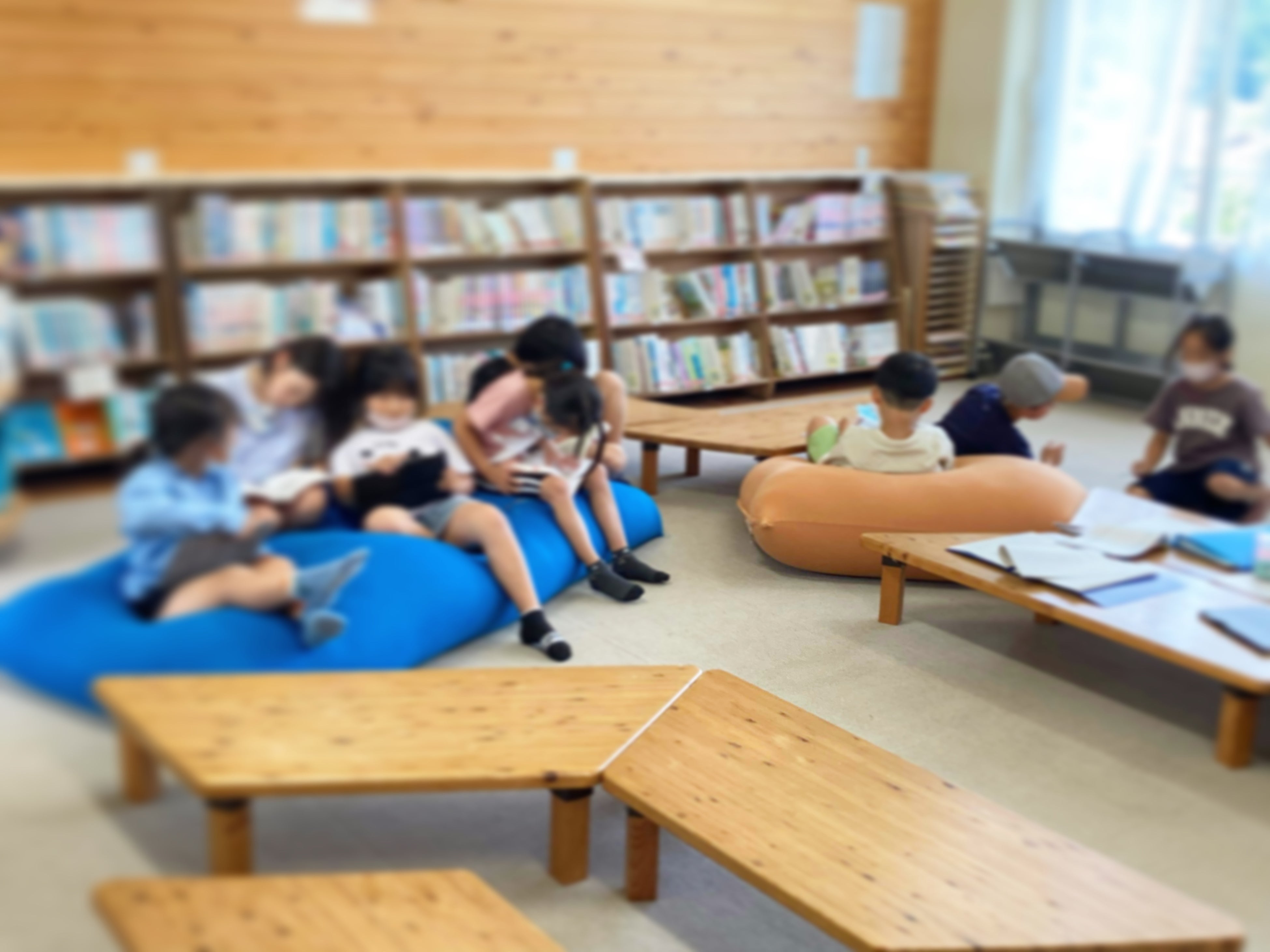 取材の日も、自律的な学習の時間に図書室を利用する子どもがいました。Yogiboを椅子代わりにして机に向かう場面もあれば、Yogiboの上でちょっとしたじゃれ合いが始まることも。