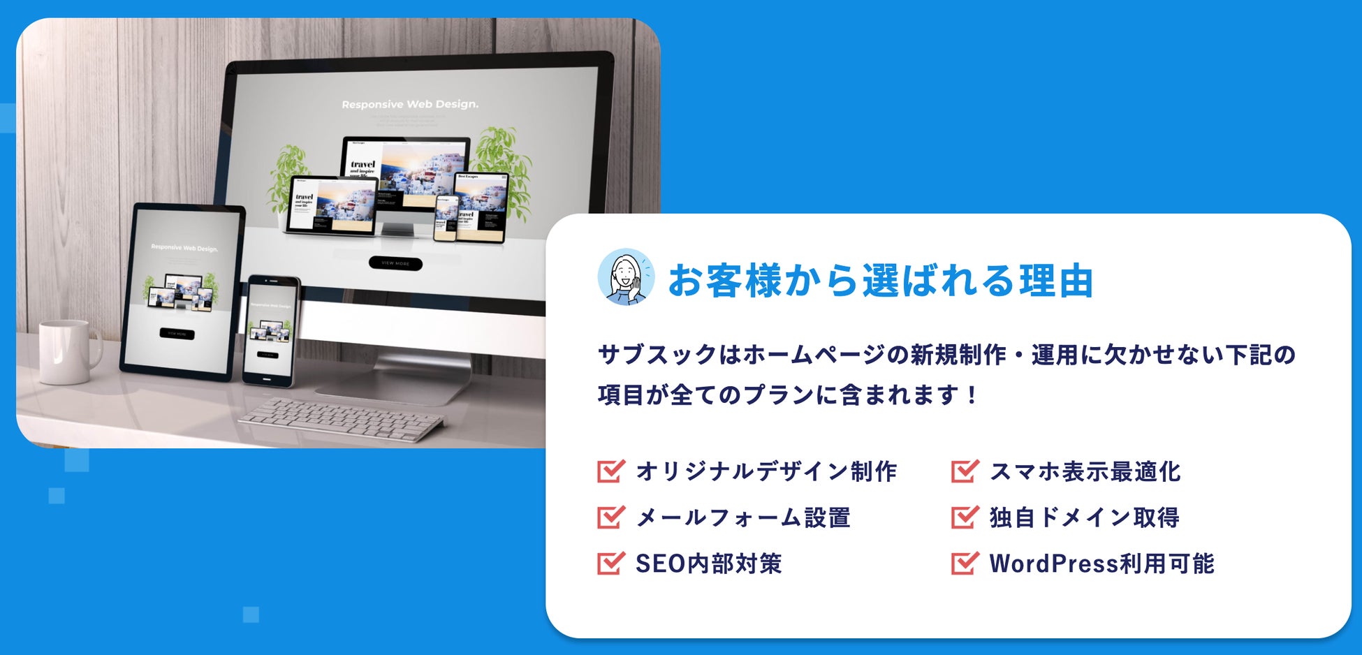 サブトックは、月額制WEBサイト制作サービスで月額料金にWEBサイトの運用で必須の項目が全て含まれて終ります。