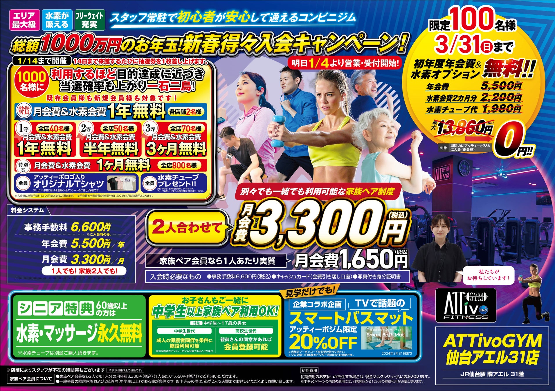 月会費・水素会費が最大で1年間無料に!スタッフ常駐で初心者でも安心して通えるコンビニジムの【ATTivoGYM】(アッティーボジム)『総額1000万円のお年玉!新春得々入会キャンペーン』好評実施中!