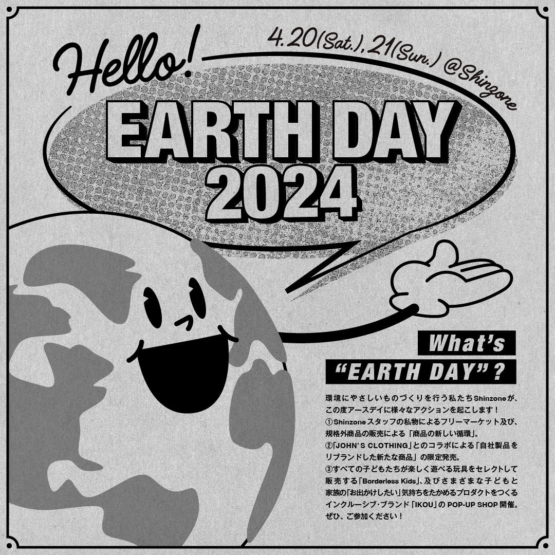 この度、株式会社シンゾーン(本社:東京都渋谷区渋谷/代表取締役:染谷裕之)が提案する「デニムに合う上品なカジュアル」をコンセプトとするブランド、Shinzoneは、4月22日(月)のアースデイを迎えるにあたり、ブランドとして初めてのイベント「HELLO! EARTH DAY 2024」を4月20日(土)と21日(日)の2日間にわたって開催いたします。