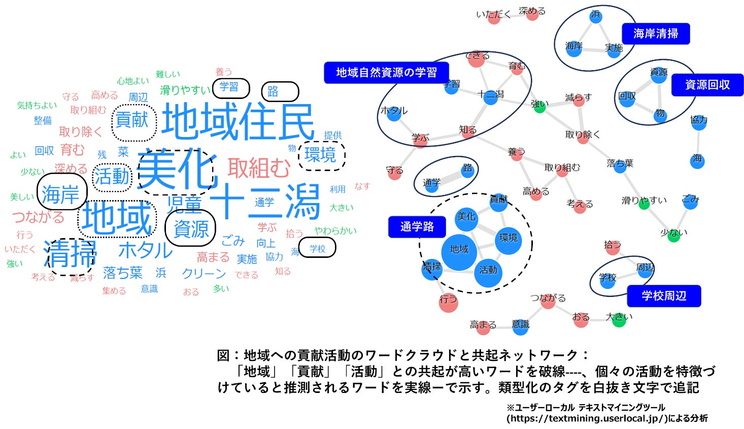 その結果、地域貢献の活動は、社会的活動、学校周辺の身近な活動、学習活動等に類型化されるものの、総じて、社会の持続可能性確保の考えに基づき、地域からの感謝を経て自己有用感の醸成につながっていました。