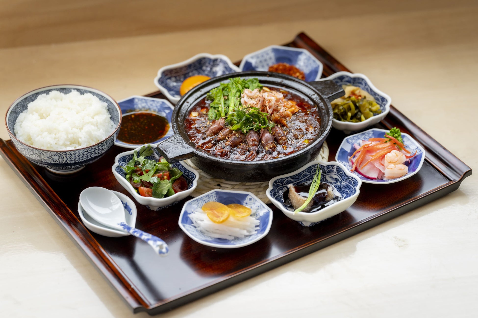 プリプリのホタルイカと桜えびを贅沢にトッピングした「季節の麻婆豆腐膳 ホタルイカと桜えび」。ホタルイカの繊細な甘みと桜えびの豊かな風味は、当店特製麻婆との相性抜群です。