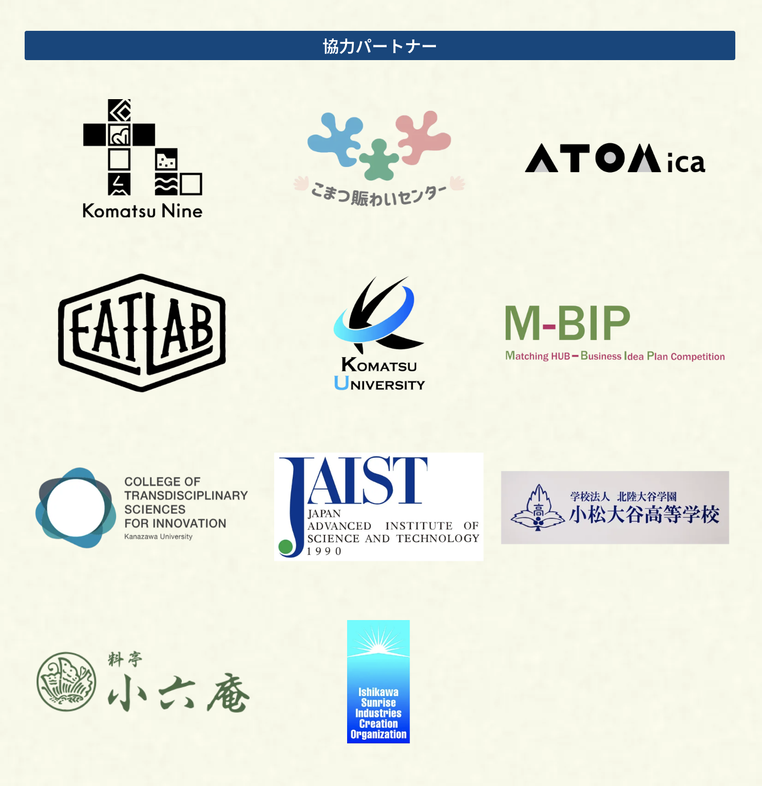 小松駅に9月にオープンした小松市観光交流センター会場、「Komatsu九」で開催する本プログラムは、小松市との連携の他にも、公立小松大学や小松大谷高等学校、北陸先端科学技術大学院大学が開催するビジネスコンテスト「M-BIP」、ATOMicaやEATLAB等ワークスペースとの連携支援など、小松市内外で活躍される事業者の皆様にサポートいただき実施にいたりました。