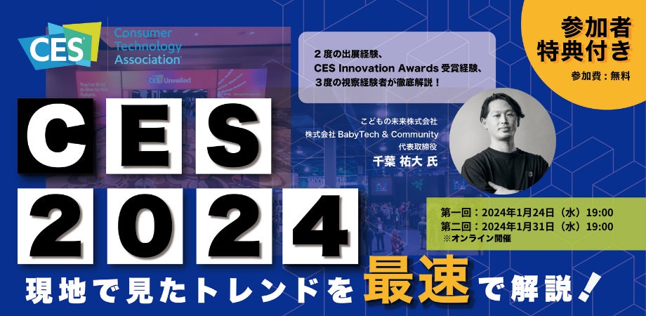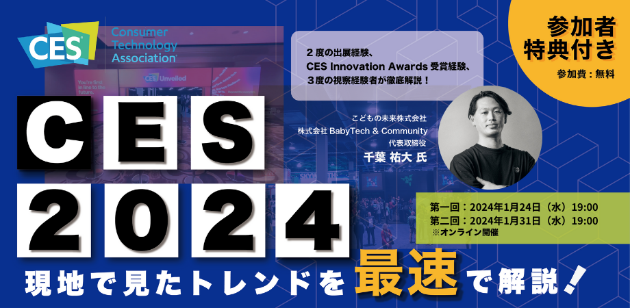 CESに過去2回出展、3度の視察経験のある千葉祐大(ちば ゆうた)が、CES2024の現地視察を終えた直後にトレンドを最速で解説します。特にInnovation Awardsの受賞経験もある『ベビーテック』分野から『ヘルステック』『フェムテック』『フードテック』など、重点的に調査した分野は深掘り解説もいたします。