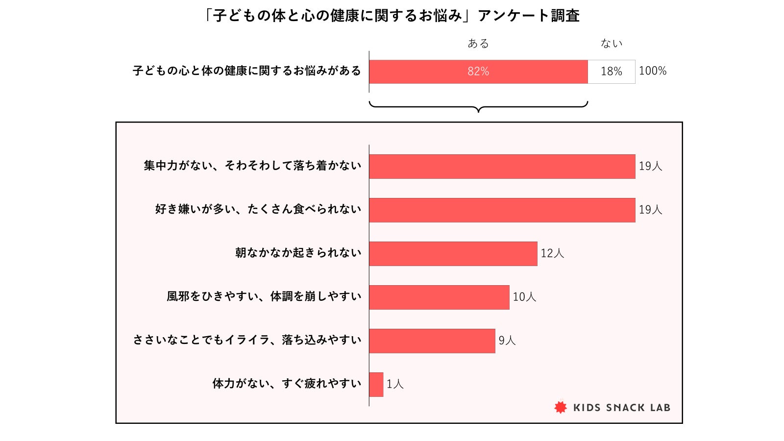 2024年1月にKIDS SNACK LABが実施した「お菓子と子どもの健康」に関するアンケートでは、悩みがあると回答した人が82%にのぼり、子どもの心と体を考えてお菓子を選ぶことの重要性が伺えます。