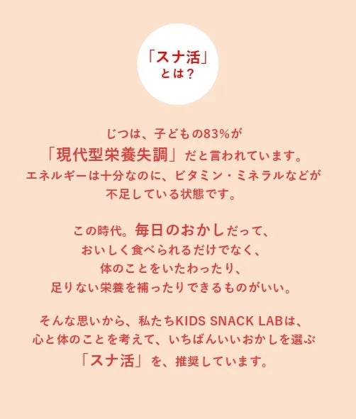 近年、6歳から8歳の子どものうち、83%が、エネルギーは十分足りているにもかかわらず、ビタミン・ミネラルなどが不足している「現代型栄養失調」の可能性があると言われています(※1)。KIDS SNACK LABは、このような時代だからこそ、おいしく食べられるだけでなく、体のことを労ったり、 足りない栄養を補えるお菓子を選ぶ、新しいお菓子との付き合い方「スナ活」を推奨しています。