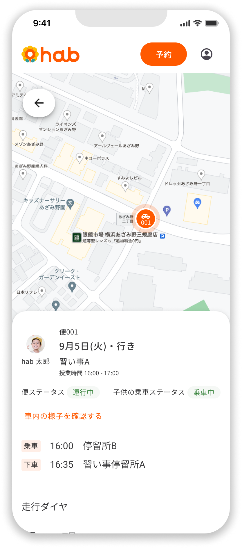 当社が提供する子供専用送迎シャトル運行システム「hab」は、地域の習い事に通うお子様が相乗りして目的地へ移動する、次世代の移動ソリューションです。お客様の送迎需要に応じたフレキシブルなルート生成と車両運行でお子様の体験機会の最大化に貢献します。