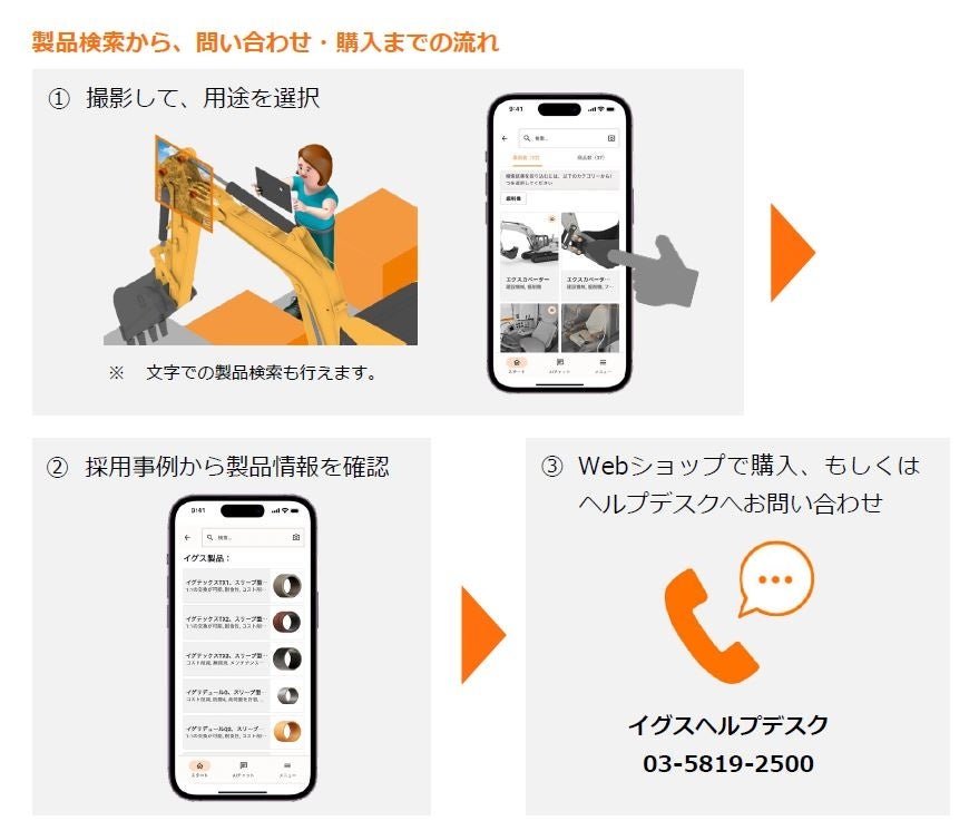 igusGOは、環境に優しく高品質・長寿命なモーションプラスチックの活用・置き換えを、ユーザーがタイムリーかつ手軽に検討できるように開発されたアプリです。日用品から家具、自動車、農工機械、包装機械まで、可動機構を持つ幅広い対象物をAIが認識し、ベアリングやリニアガイドなど、活用・置き換えの可能性があるイグスの無潤滑部品をユーザーに提案します。用途など数項目を選択するだけで、効率的に製品や採用事例を見つけることができ、そのままWebショップでの購入もしくはお問い合わせが可能です。