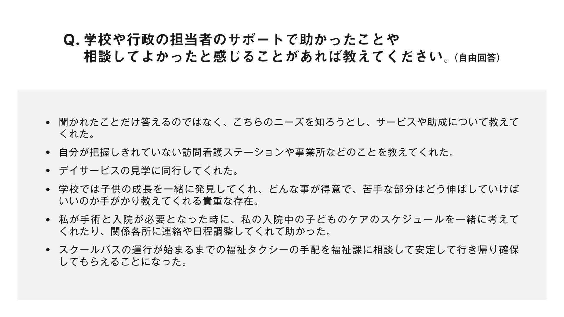 学校や行政の担当者のサポートで、助かったこと・相談してよかったこととして、「把握していなかったことを教えてくれた」や「困った際にサポートしてくれた」といった内容のコメントが目立ちました。学校や行政による、ひとりひとりに合わせたサポートが利用者の満足につながっているようです。