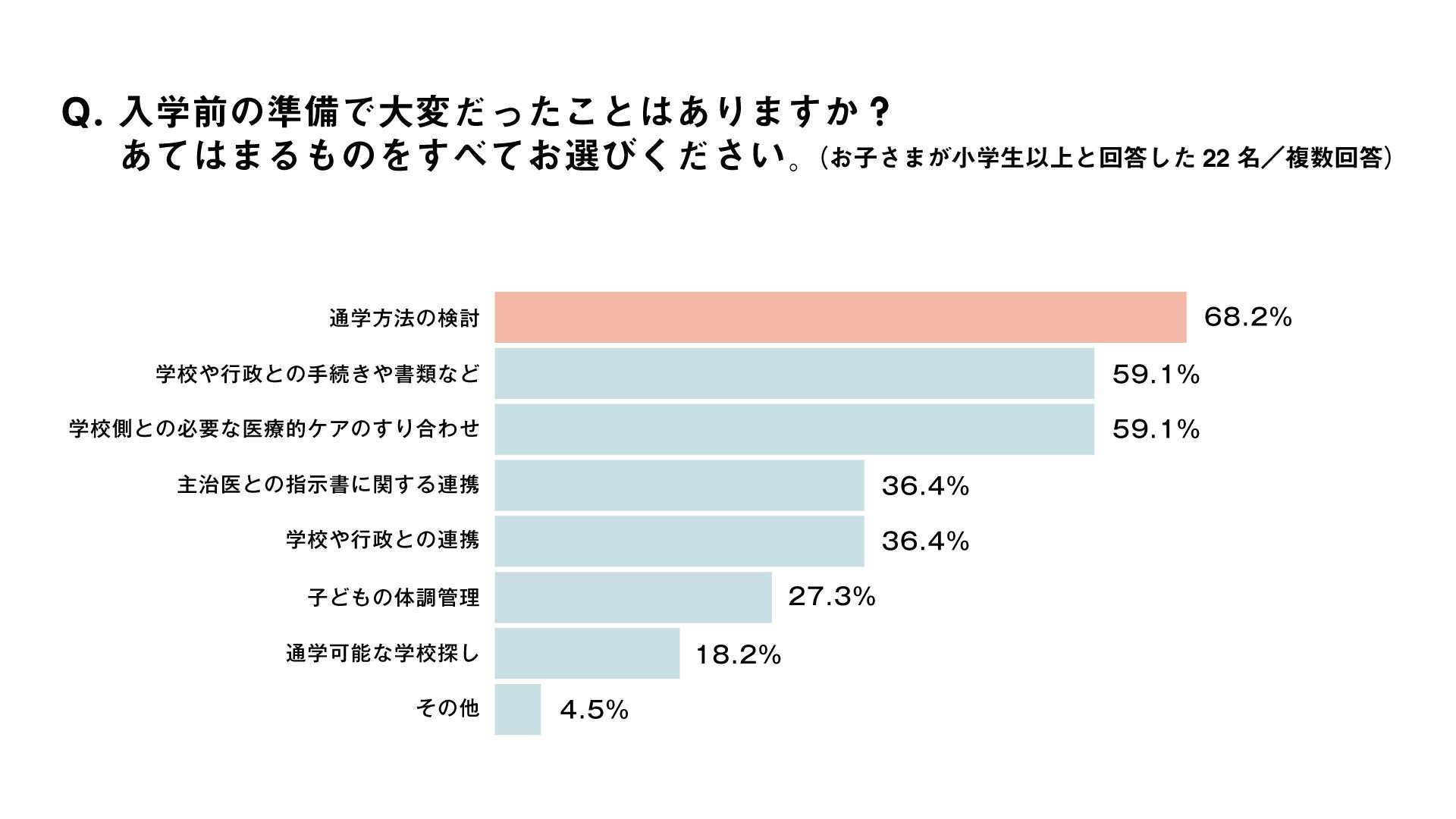 ソイナースの利用者のうち、現在お子さまが小学生以上と回答した人に入学準備で大変だったことを聞いたところ、「通学方法の検討」が68.2%と最多でした。医療的ケア児の通学時には保護者や看護師の付き添いが必要になるため、入学前の調整が大変なようです。次いで「学校や行政との手続きや書類など」「学校側との必要な医療的ケアのすり合わせ」が過半数を超えました。