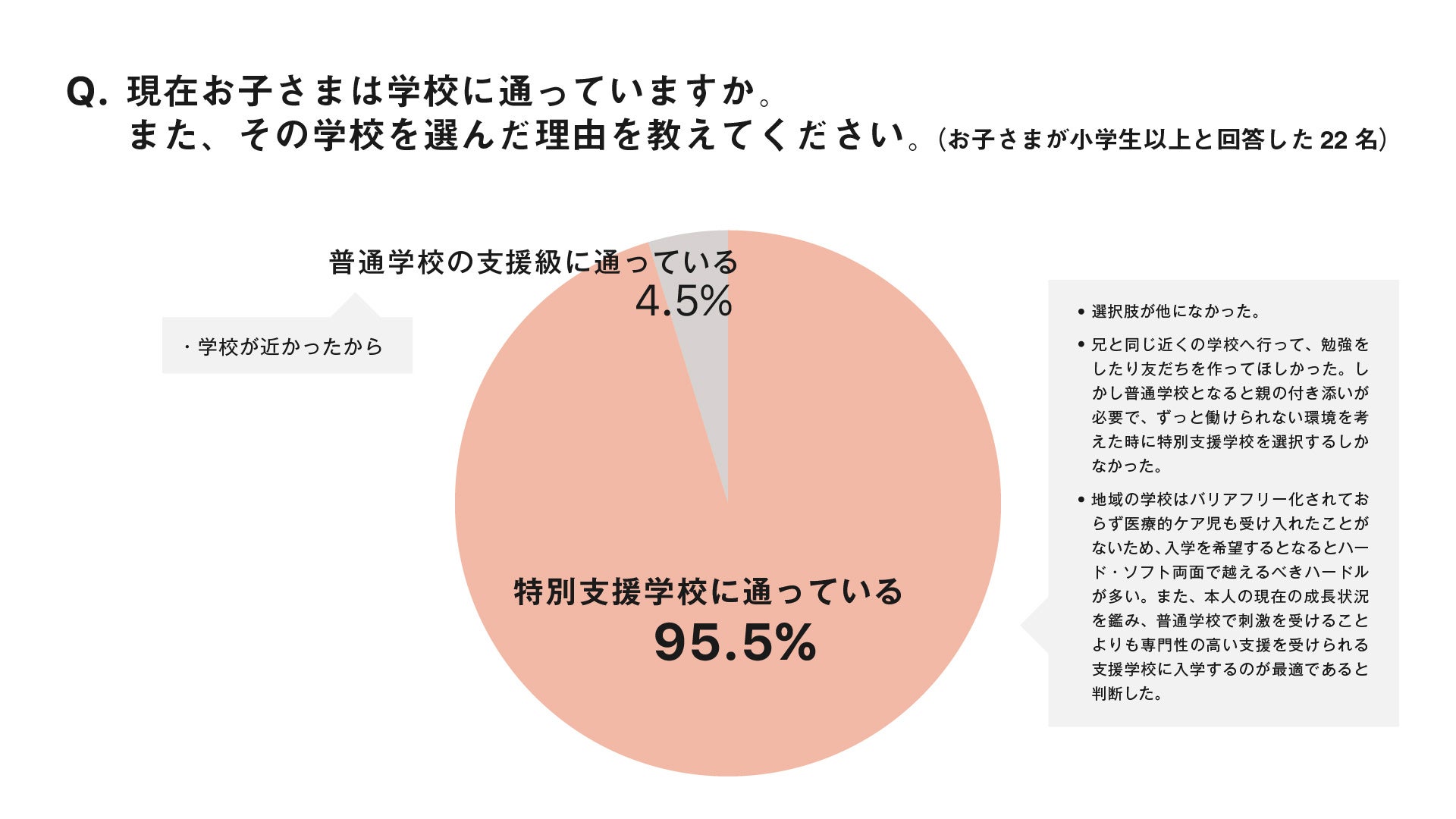 ソイナースの利用者のうち、現在お子さまが小学生以上と回答した人に通学状況を聞いたところ、「特別支援学校に通っている」が95.5%と最多でした。特別支援学校を選択した理由について、「選択肢が他になかった」「本人の成長状況を考えて最適と判断した」といったコメントがみられました。必要とするケアは児童それぞれで違いますが、受け入れ態勢が整っている特別支援学校を選択するケースが多いようです。