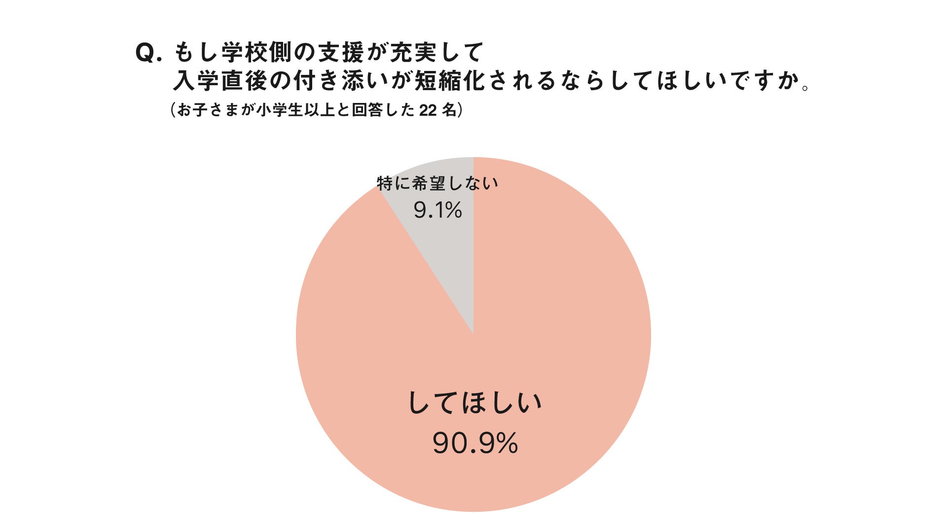 「学校側の支援が充実して入学直後の付き添いが短縮化されるならしてほしい」と回答したのは90.9%と9割を超えました。半年以上、親の時間を調整しながら学校生活の付き添いをすることは親の負担が大きいため、学校側の支援の充実によって負担を軽減させたいと考える人が多いようです。