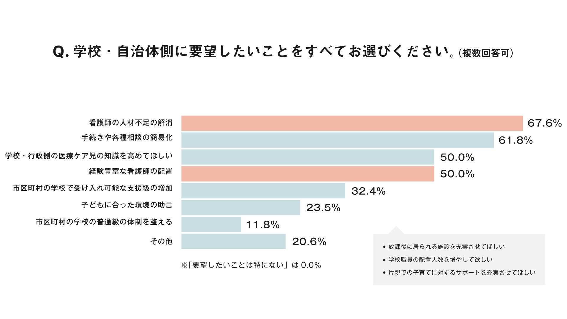 学校・自治体側に要望したいことは「看護師の人員不足の解消」が最多でした。また、半数が「経験豊富な看護師の配置」と回答しており、経験豊富な看護師をより多く配置してほしいというニーズがうかがえます。
