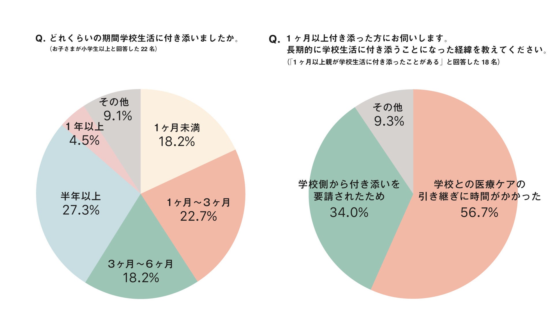 現在お子さまが小学生以上の人のうち全員が学校生活に付き添ったことがあると回答しました。付き添い期間は「半年以上」が最多の27.3%でした。長期間付き添うことになった理由は「学校との医療ケアの引き継ぎに時間がかかった」が最も多く56.7%でした。