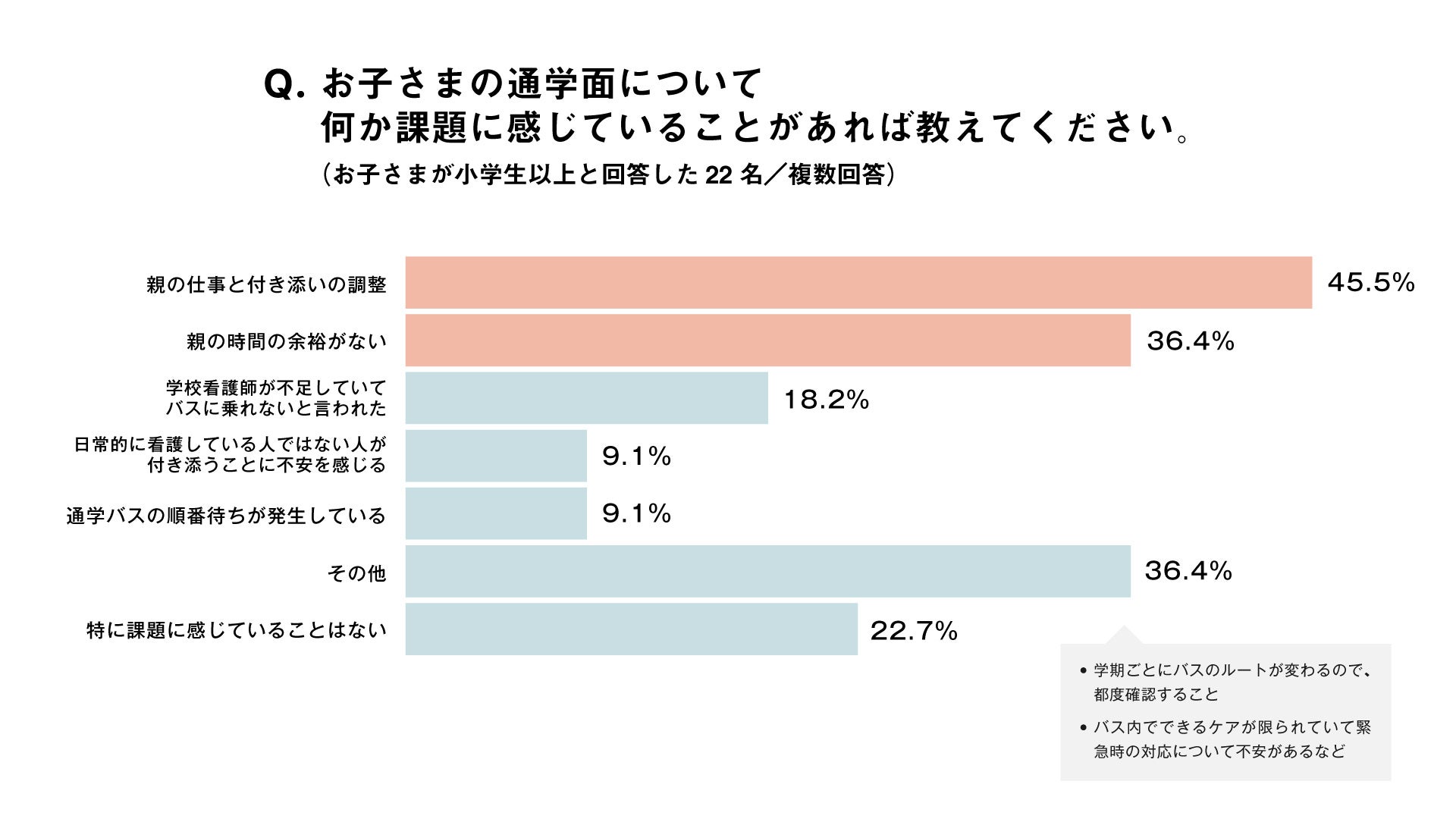 通学面での課題について、「親の仕事と付き添いの調整」が45.5%とトップでした。また、2位には「親の時間の余裕がない」が続き、親の時間に関する項目が続きました。さらに、その他では「学期ごとにバスのルートが変わるので、都度確認すること」や「バス内でできるケアが限られていて緊急時の対応について不安がある」が続き、それぞれに多様な課題があるようです。