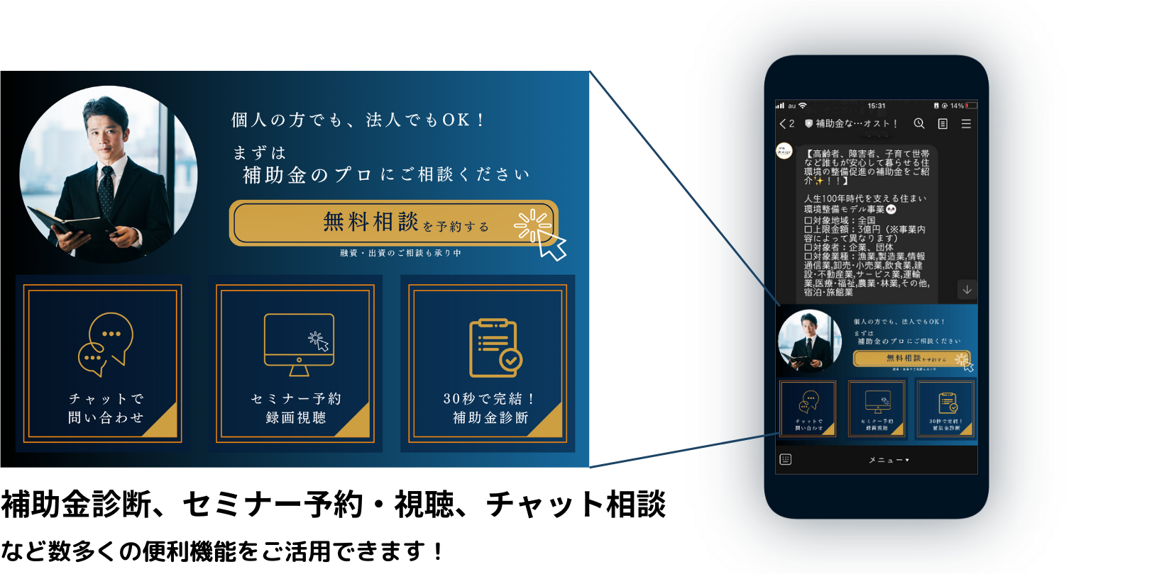 この度、補助金に関する最新情報やセミナー動画を配信するLINE公式アカウント「補助金ならレオスト!」を開設しました。貴社に合う最新の補助金情報を配信するだけでなく、補助金診断やセミナー予約も可能です。