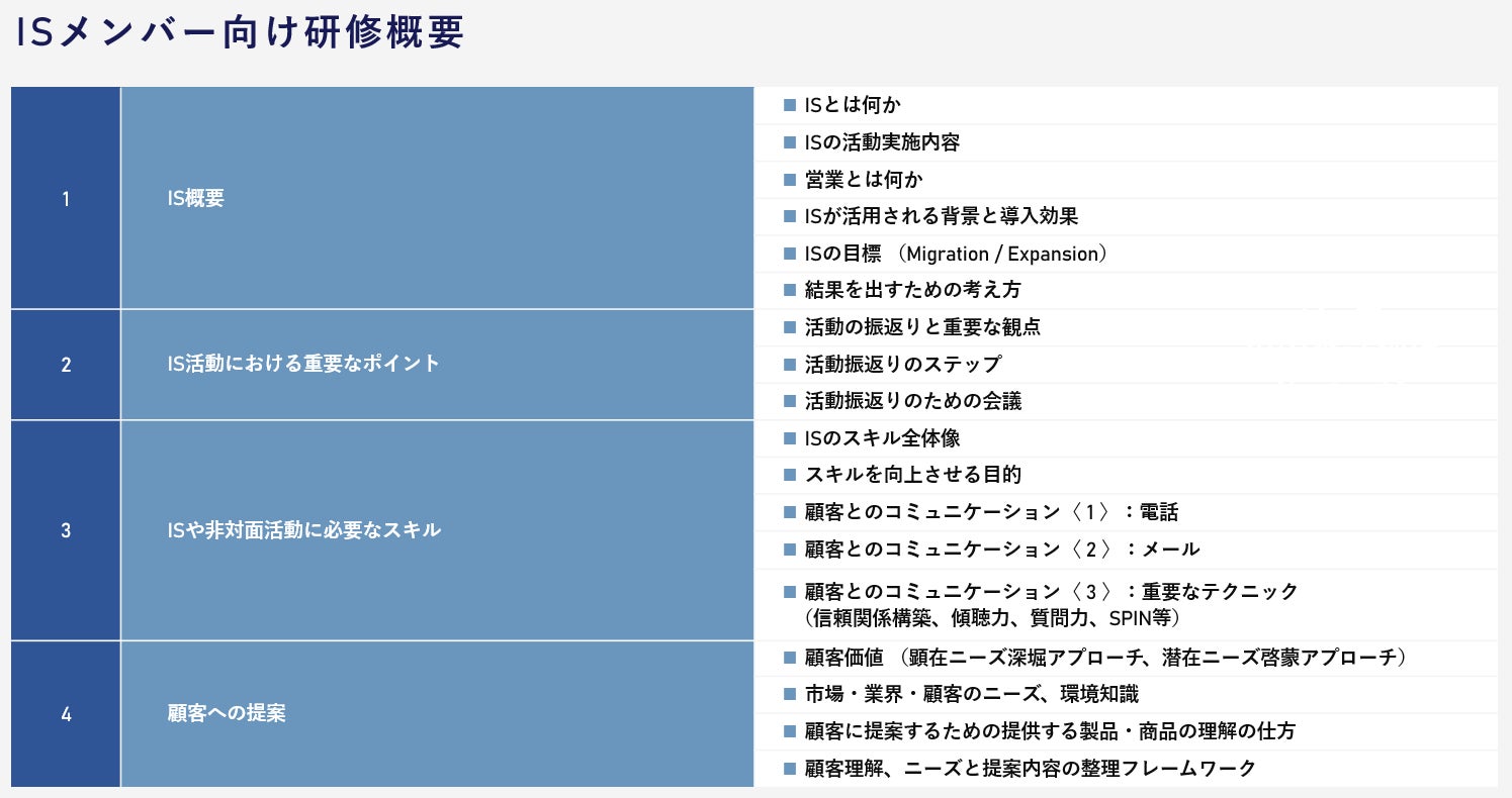 以前のコロナ等の社会的情勢もあり、既に多くの日本企業でインサイドセールスを導入されております。一方、これまで経験のない方々やマネージャーの方が社内移動で担当され、苦労されている企業の方も多いとお聞きします。我々もこれまで基本的なTipsとなる研修は実施してきたものの、研修だけを実施してもなかなか身につきにくい (実際の行動変容に至らない) ことも事実です。そのため、研修のみならずマネージャーの方やインサイドセールスの方々に伴走しながら、皆さんの活動成果が上げられないか、と考えたのが本プログラムを設計する出発点でした。