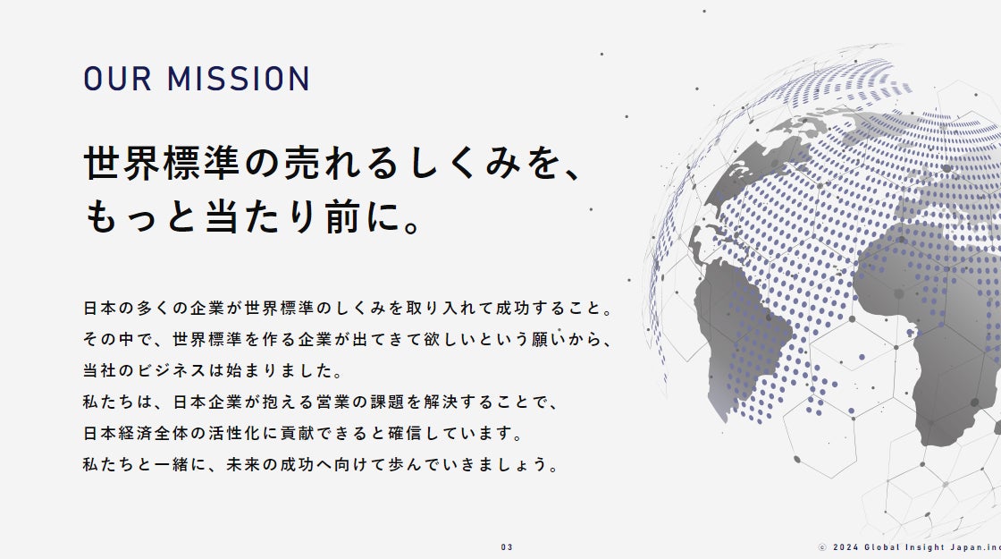 CEO水嶋玲以仁氏率いるグローバルインサイトジャパン合同会社(GIJ)は「世界標準の売れるしくみを、もっと当たり前に。」をミッションに掲げ、企業の営業やインサイドセールス、マーケティングの課題を解決するためのサービスを提供しています。