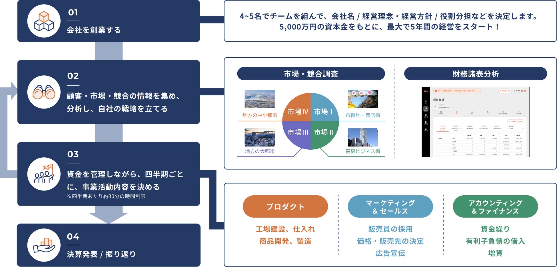 チームを組んで企業を創業し、商品を製造するための生産計画、顧客に商品を販売するためのマーケティング戦略、必要な資本を集めるための資金計画などを考えながら、事業運営に取り組みます。