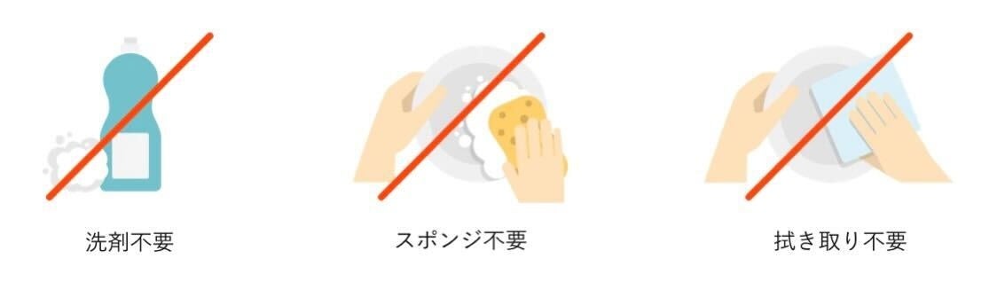 「汚れが落ちやすいお皿」と、「水ですすぐだけで汚れが落ちるお皿」は全く異なります。通常のお皿洗いの工程では【予洗い→スポンジに洗剤をつける→スポンジでお皿をこすり洗いする→水で洗剤を流す→スポンジを洗い、手についた泡を水で流す】という工程が必要ですが、当社のお皿は「水で流す」だけです。