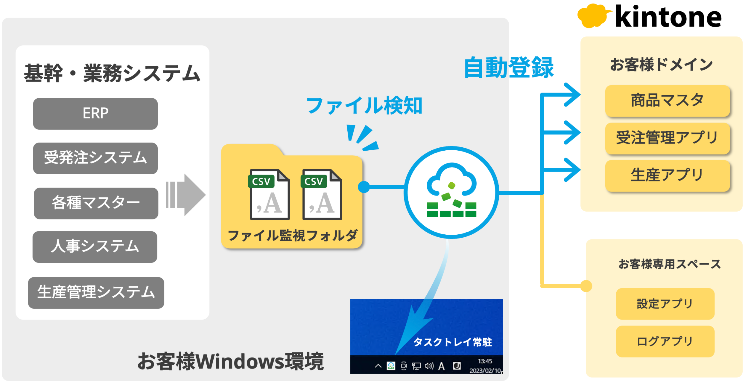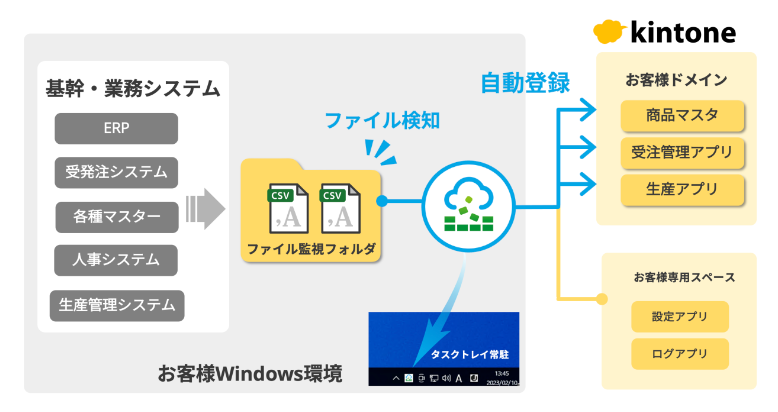 CSV連携:Windows上のフォルダにCSVファイルを置くだけで「データ整形からkintoneへの登録」までを全て自動で行います。商品マスターや売上情報など、基幹・業務システムから出力されるCSVデータをkintoneに簡単に連携できます。