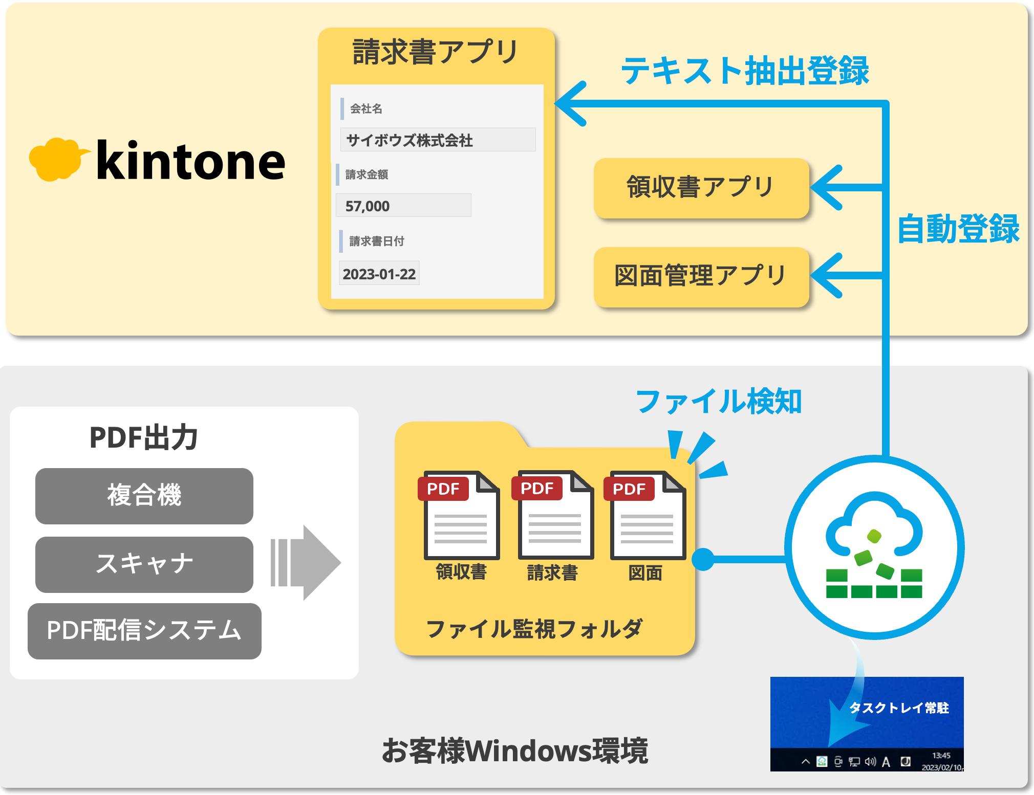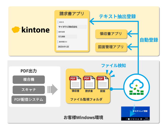 PDF連携:複合機FAX、スキャナ、ERP等などから出力される大量のPDFファイルをkintoneへ自動アップロードします。またPDF内部の文言を読み取り指定したフィールドへの登録も可能です。これにこれによりブラウザを起動して添付ファイルフィールドに手動登録する必要がなくなり、作業コストと時間を大幅に削減します。