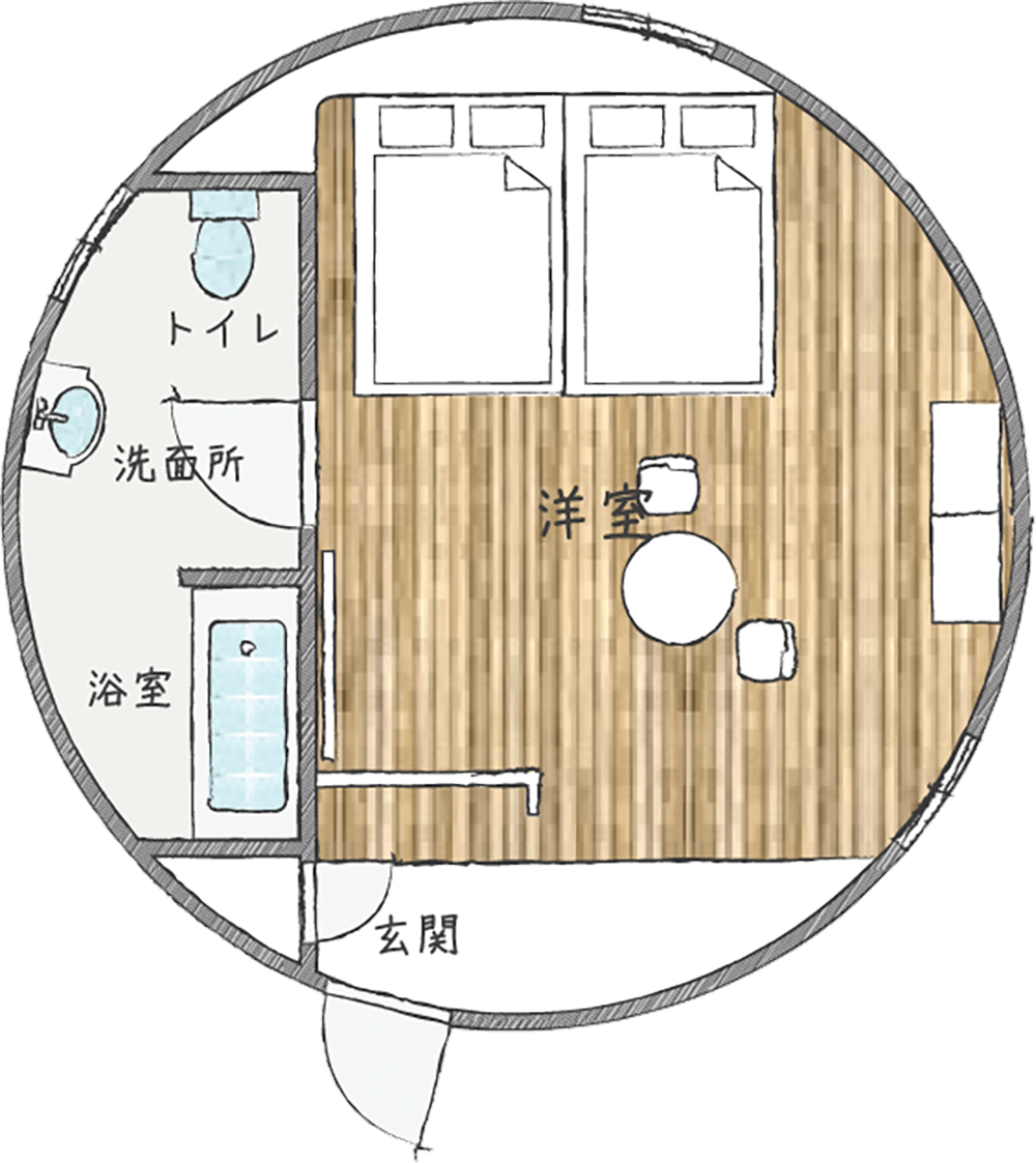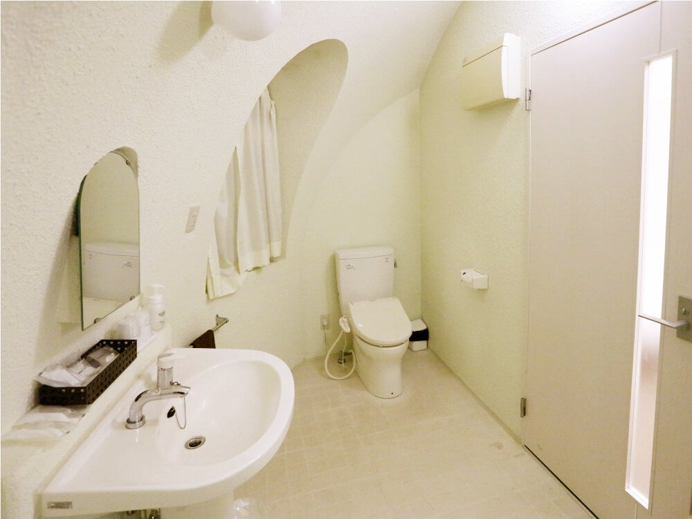 半球体の壁面側に設置したサニタリーは不思議な空間を演出します。