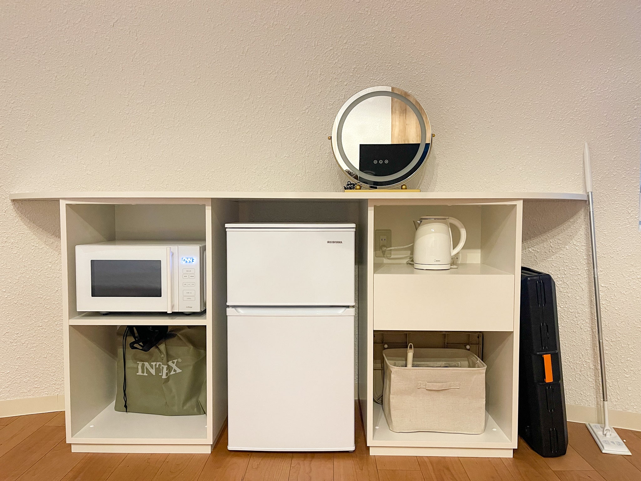 冷蔵庫、電子レンジ、ケトルが備え付けとなっており、快適にお過ごしいただけます。