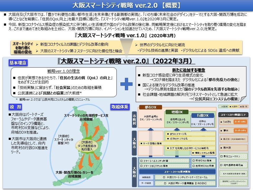 2022年3月には、新型コロナウイルス感染症の感染拡大に伴う新しい生活様式や国のデジタル政策の強化等、同戦略策定後におけるスマートシティを取り巻く環境の変化を踏まえ、これまで進めてきた取組みを土台に、 大阪・関西万博に向け、イノベーションを加速させていくため、「大阪スマートシティ戦略ver.2.0」を策定いたしました。