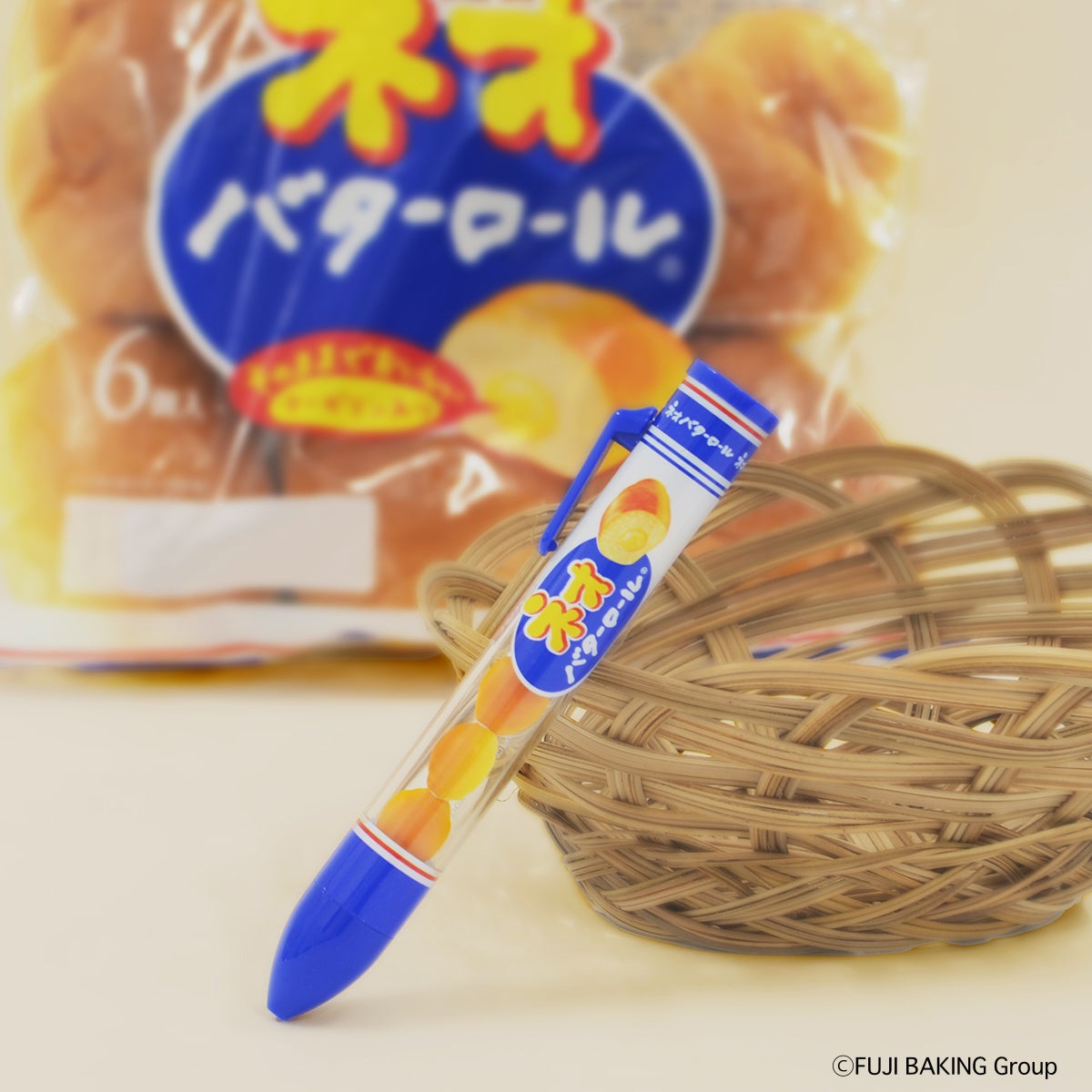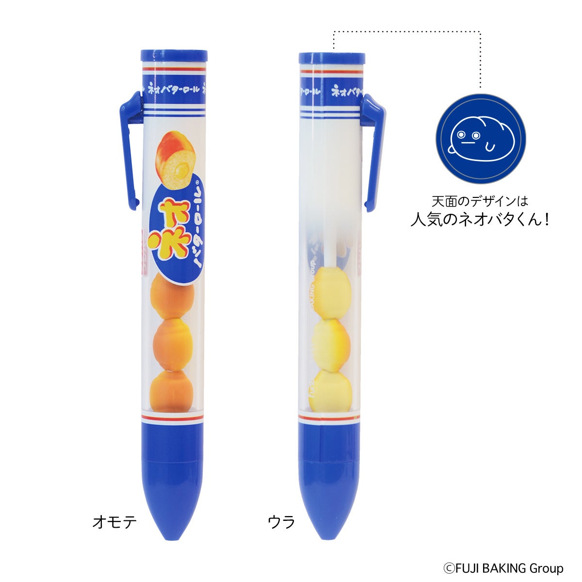 ボールペンの軸の中に「ネオバタ―ロール」風のマスコットが入っていて、ペンを振るとマスコットが「サクサク」上下に動きます。マスコットも「本物そっくり」な形状や色味にこだわっており、透明な軸にパンが入っているさまは、まるでパッケージに入った本物の「ネオバタ―ロール」のよう。ペンの天面にデザインされている、公式キャラクター「ネオバタくん」もポイントです。