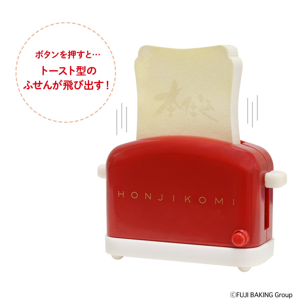 右下の小さなボタンを押すと美味しそうな「本仕込食パン」型の付箋(ふせん)が飛び出す、トースター型付箋スタンド。パン(のような付箋)が勢いよく飛び出す様子は、思わず笑顔になってしまいます。付箋は「本仕込食パン」の実物と見比べながらデザインしたこだわりの形状で、手帳やデスク周りに貼ってもかわいく、見ているだけでお腹がすいてしまいそう。トースター部分は今年7月にリニューアルした「本仕込食パン」の新しいパッケージをイメージした配色です。