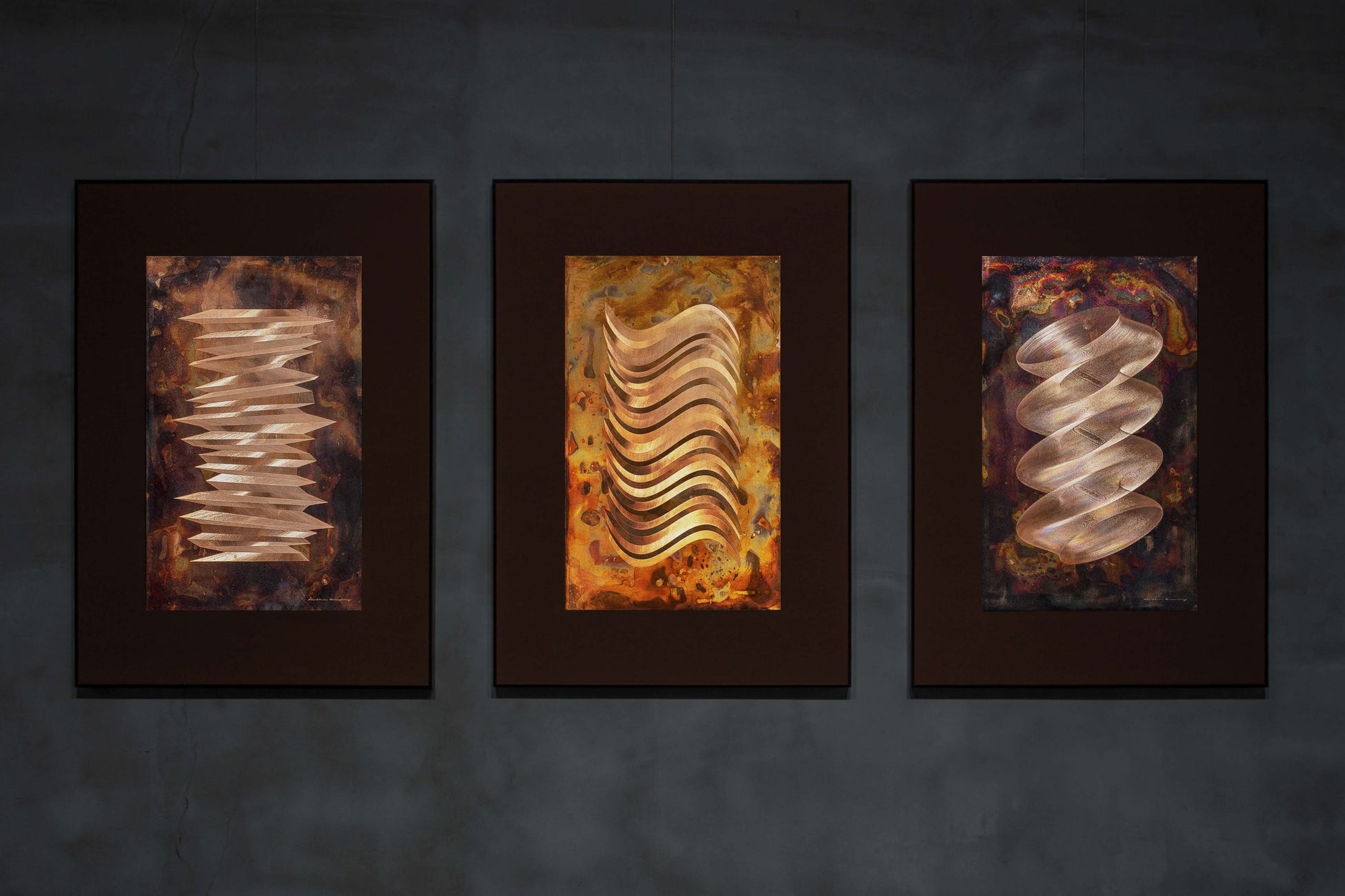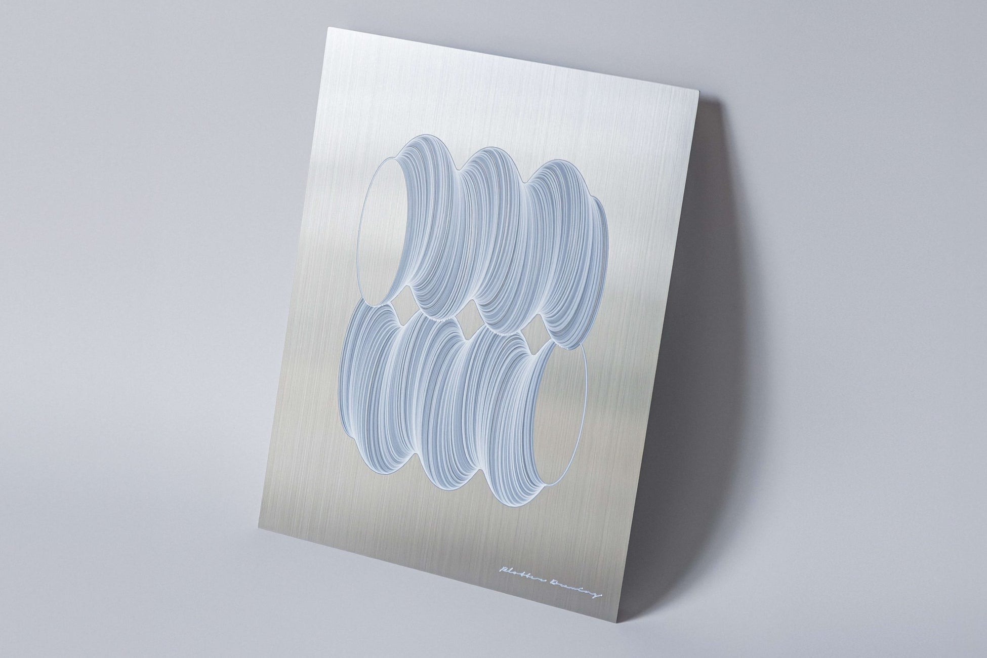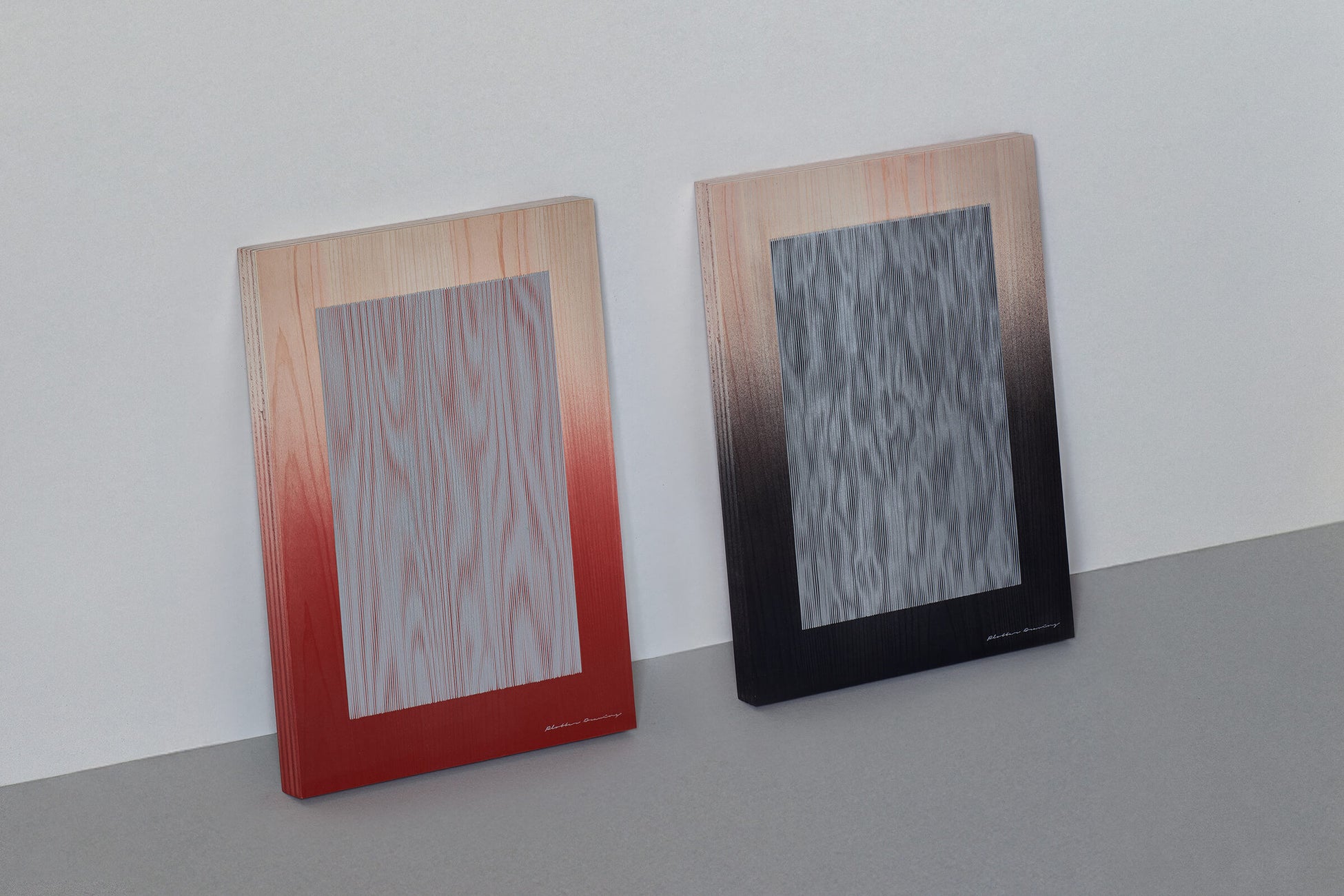 新作の「OnWood」シリーズは、グラデーション染めを施したヒノキの板に、プログラミングを用いた木目のグラフィックを描いた作品。自然が生み出した木目と、人の手によって作られた木目の重なりは、デジタルとリアルの境界を曖昧にし、有機と人工が共鳴する風景を生み出します。